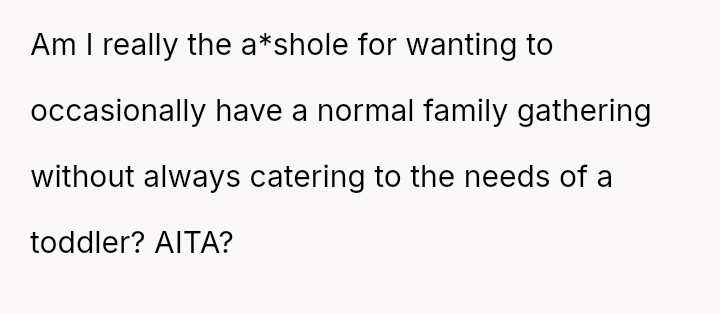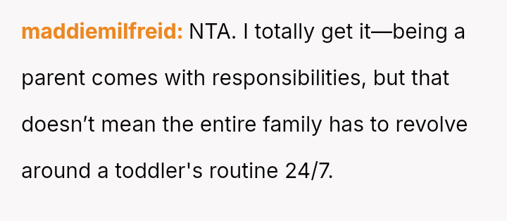 Is the original poster justified in seeking occasional family time where the toddler's schedule and needs do not dictate all planning, or should the family prioritize accommodating the primary caregiver's es**blished routines and the child's needs above all else?