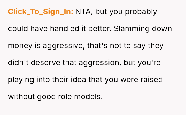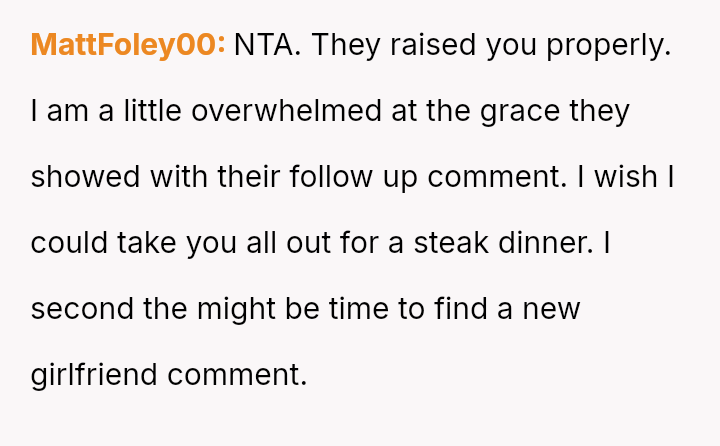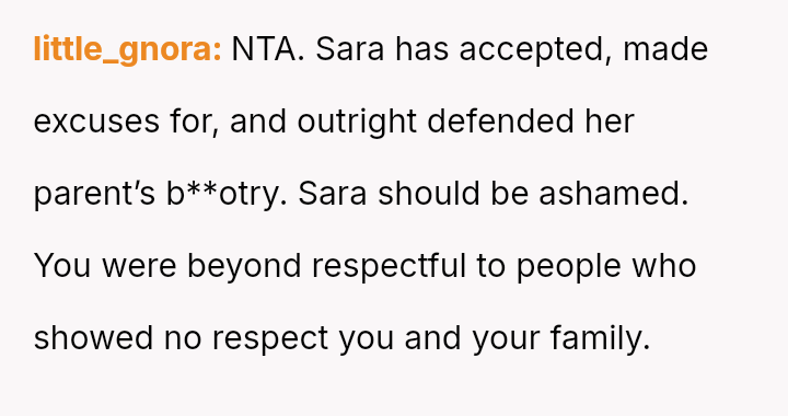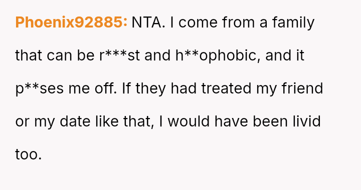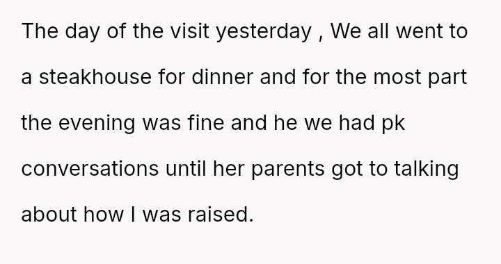 Given the OP's deep bond with his guardians and the severe offense taken by the judgmental comments, was his impulsive departure an appropriate defense of his family's honor, or did it const*tute an unacceptable breach of etiquette that unfairly burdened his partner in front of her parents?