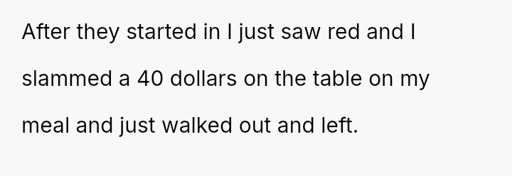 His immediate reaction was to defend his family by abruptly leaving the dinner, which aligns with a strong sense of loyalty but directly contradicts his partner's prior request for discretion and her view that his exit was rude and an overreaction.