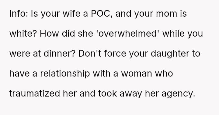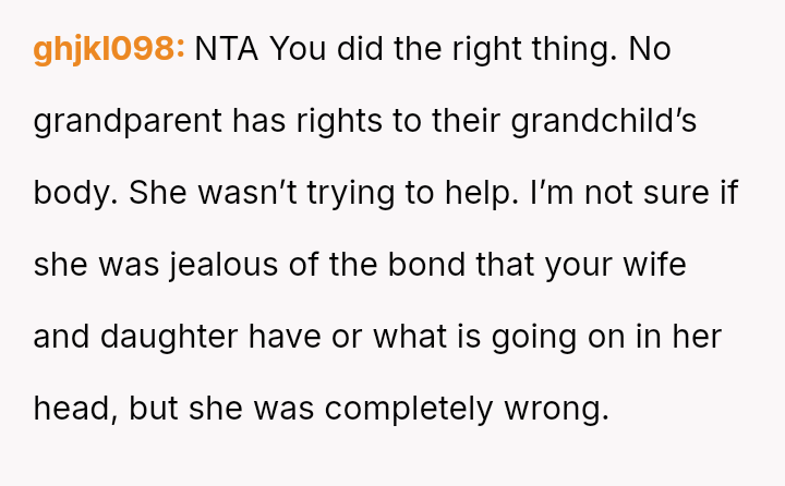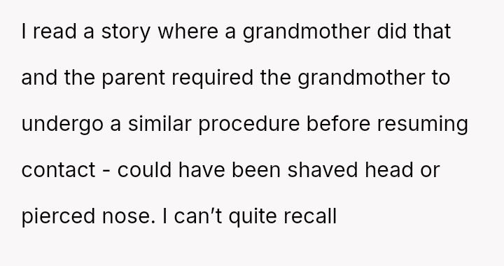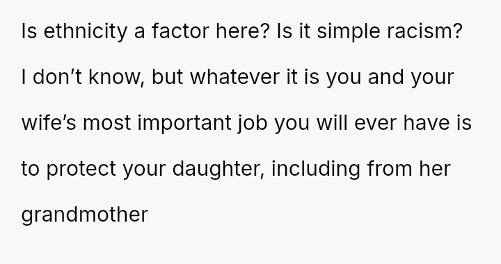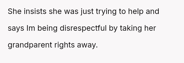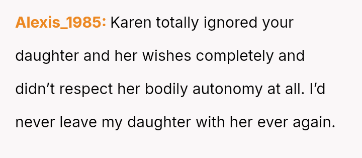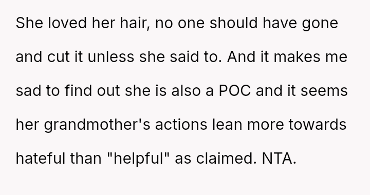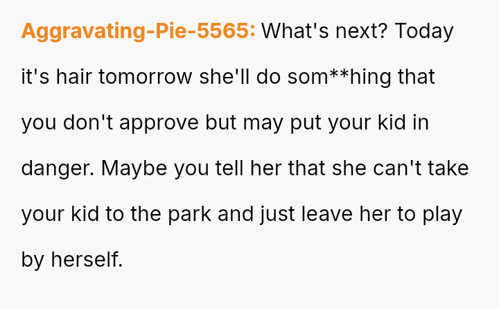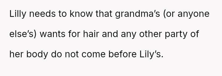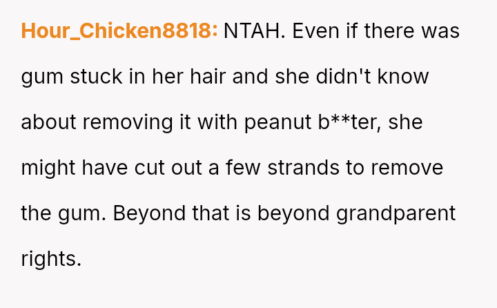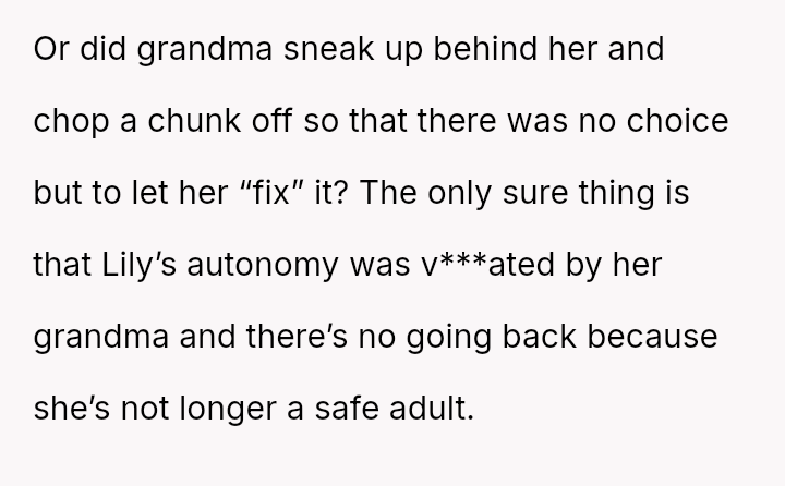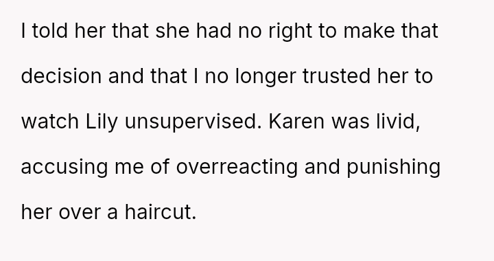 The parents confronted the grandmother, who dismissed their concerns by saying, 'it's just hair and it will grow back.' The father then stated he no longer trusted her to watch Lily unsupervised, leading the grandmother to become angry and accuse him of overreacting and punishing her by suggesting she would lose grandparenting privileges. The father is now questioning if he was too harsh by taking this action.