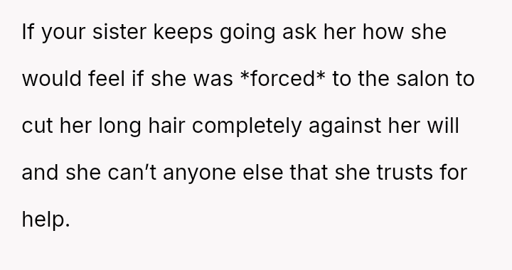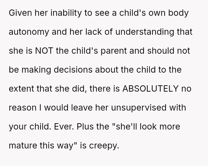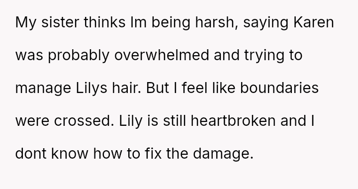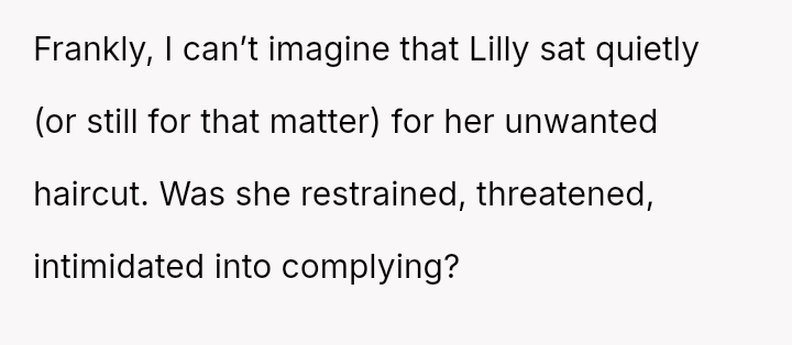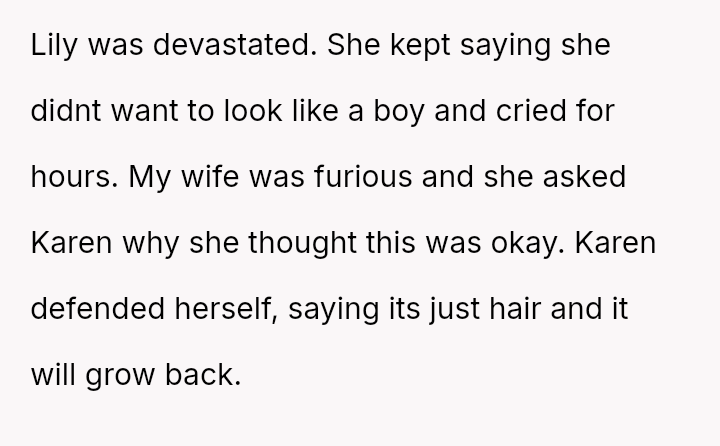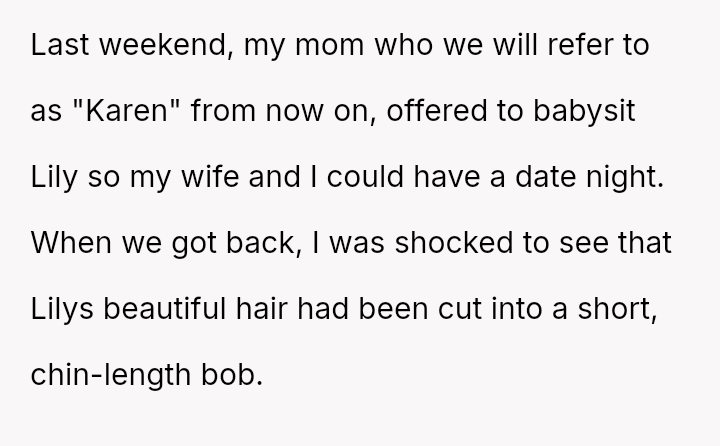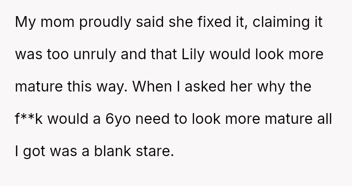 Upon their return, the parents discovered that the grandmother had cut Lily's long hair into a short, chin-length bob, claiming she was 'fixing' it because it was too unruly and that Lily would look more mature.