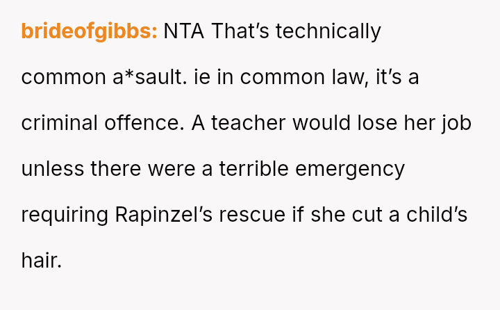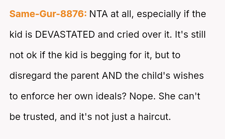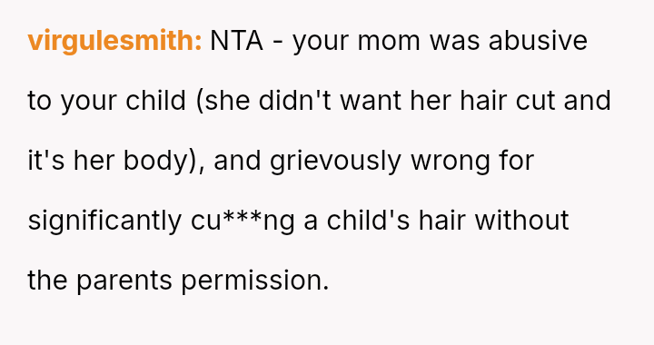 The Original Poster (OP) is dealing with the fallout of a significant v***ation of trust after his mother unilaterally cut his daughter's hair, causing the child great distress.
