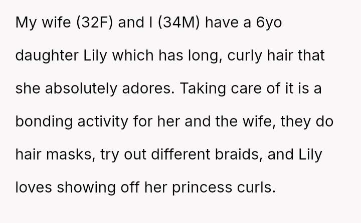 A husband (34M) and his wife (32F) have a six-year-old daughter named Lily who deeply loves her long, curly hair.