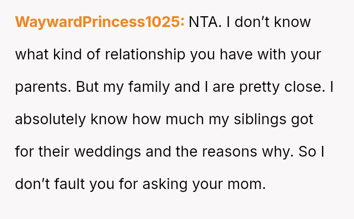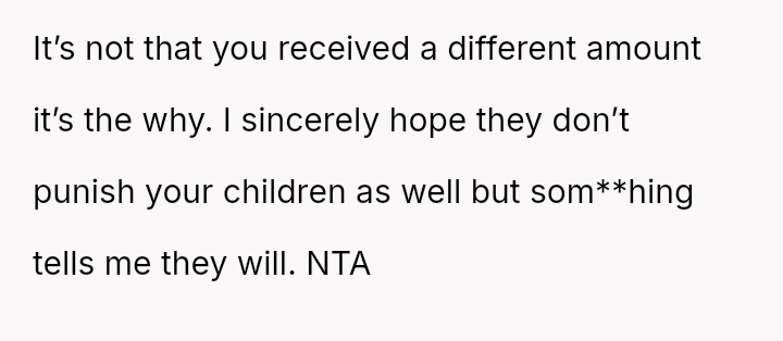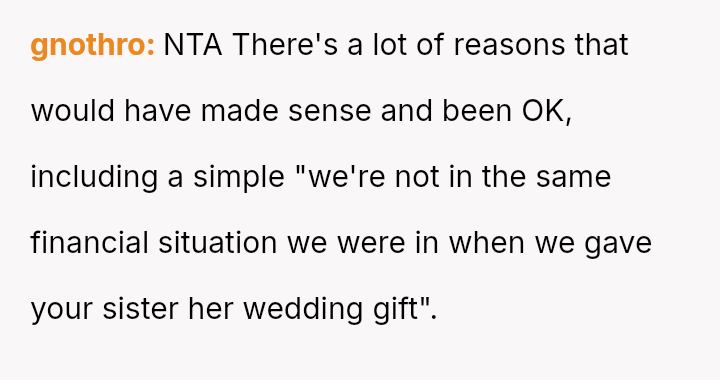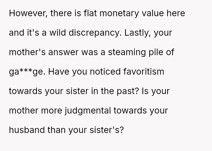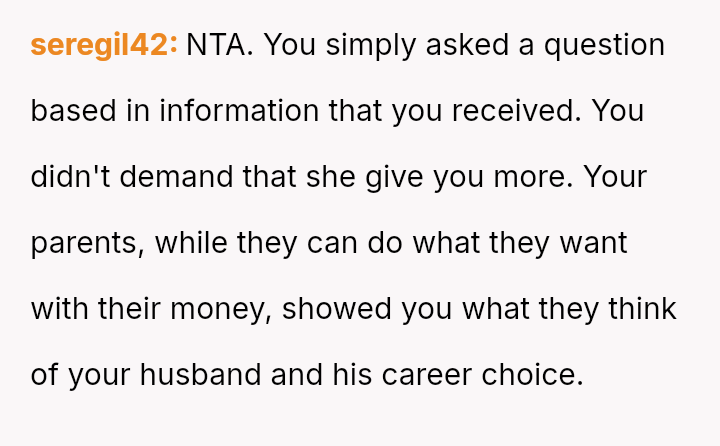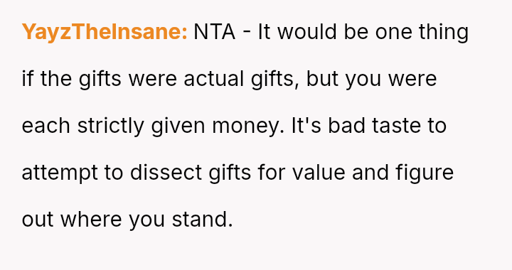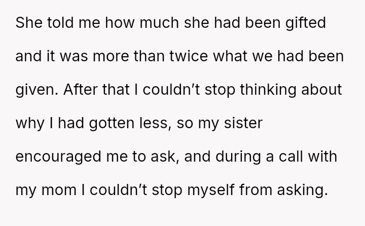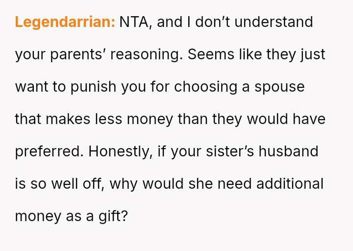 The original poster (OP) is grappling with feelings of being undervalued or judged by their parents following the revelation of unequal wedding gifts, which were explicitly tied to their spouse's lower earning potential compared to their sister's.