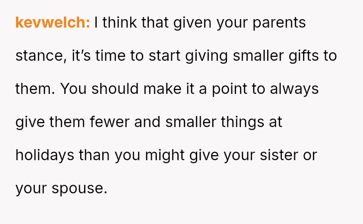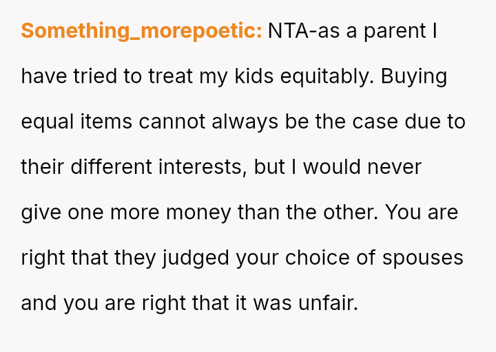 The central conflict lies between the OP's expectation of equal parental love and support versus the parents' belief that financial gifts should reflect the perceived lifestyle compatibility of the recipients' chosen partners.