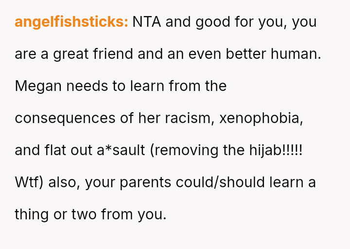 The original poster (OP) acted strongly to defend their friend, Aysha, against severe religious h***ssment, resulting in significant consequences for the aggressor, Megan.