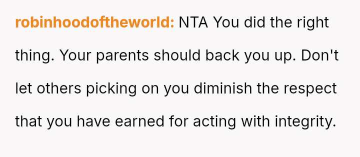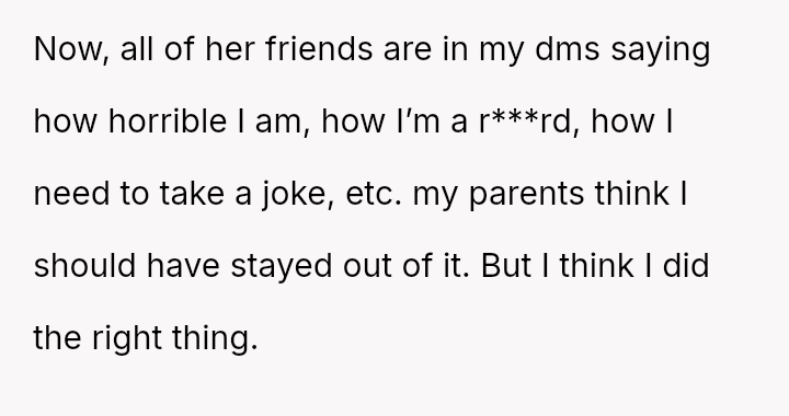 This defense, while supported by the OP's moral conviction, has caused a major social backlash against the OP from p*ers, and has created a disagreement with the OP's parents, who preferred non-involvement.
