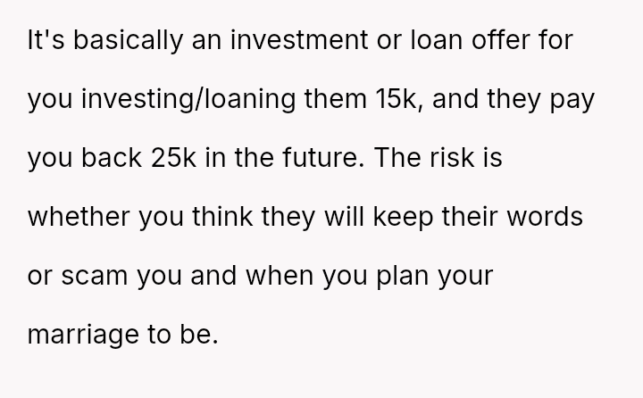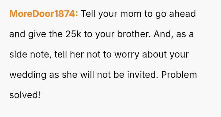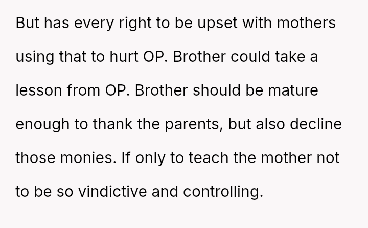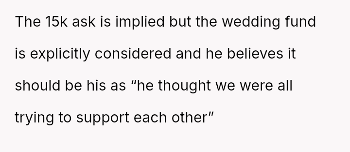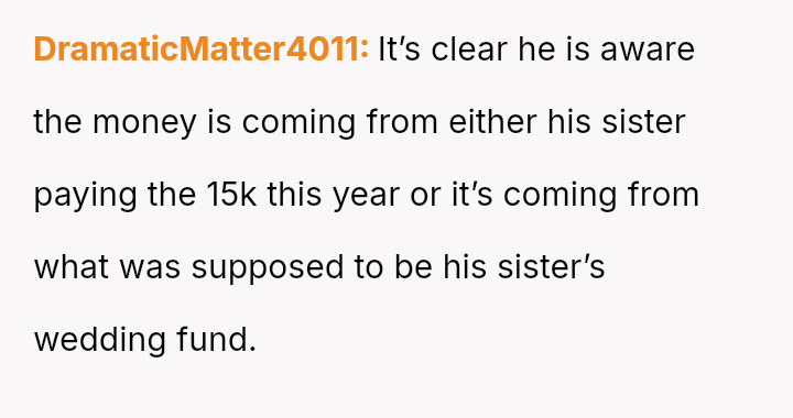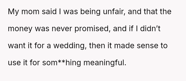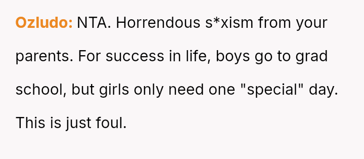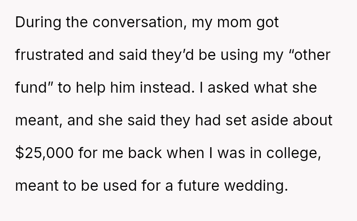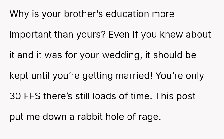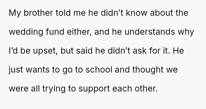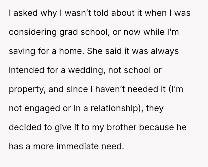 The original poster (OP) is experiencing significant emotional distress due to her parents reallocating a surprise, previously undisclosed fund, originally designated for her future wedding, to finance her brother's prestigious graduate stud*es.