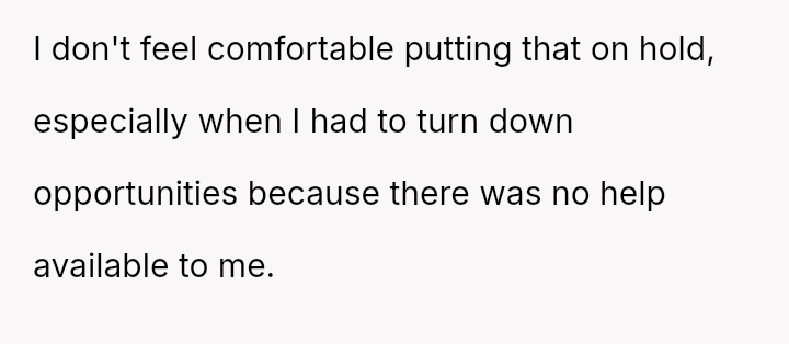 Her conflict stems from a deep sense of unfairness, as she achieved financial independence without support and is now seeing resources intended for her future redirected to cover her brother's immediate educational costs, despite her own sacrifices.
