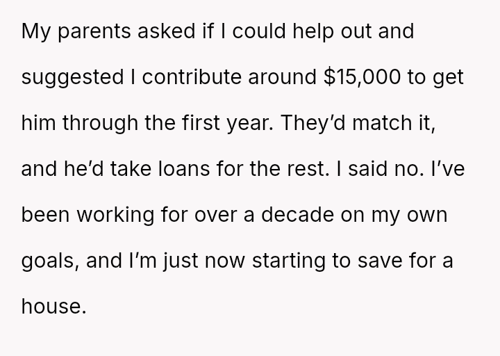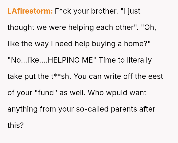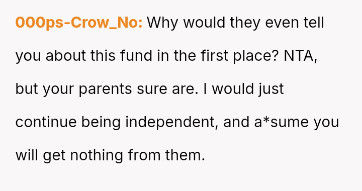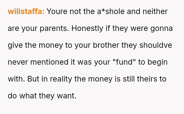 Given the parents' unilateral decision to repurpose a fund intended for the OP without her consent, should the OP demand the funds be returned or redirected to her stated goals (homeownership/past education costs), or is the parents' right to manage their a*sets to support the child with the most immediate, high-potential need the overriding ethical consideration?