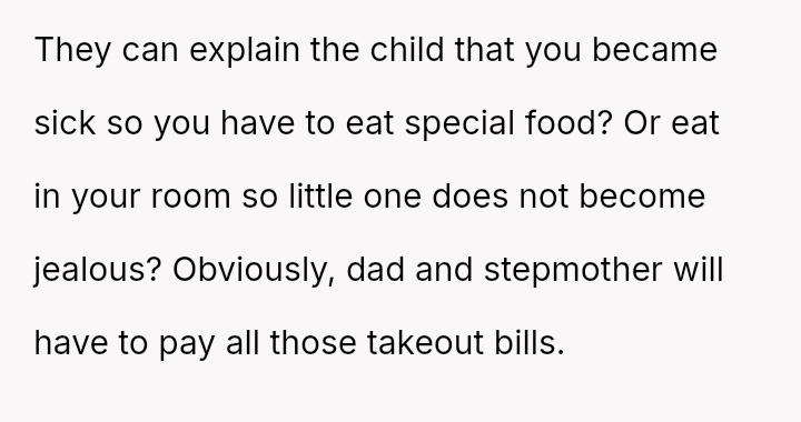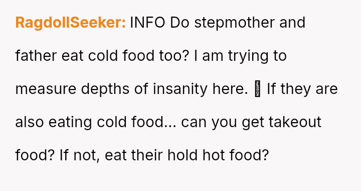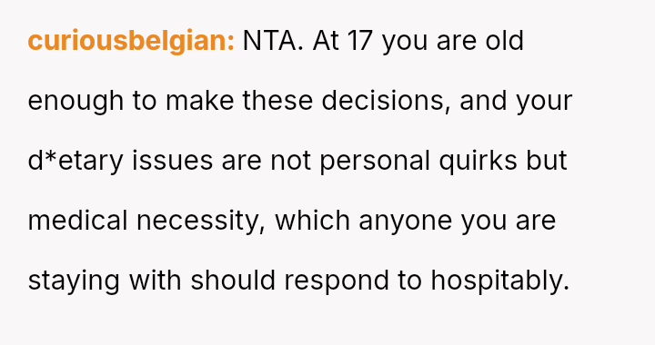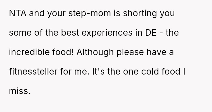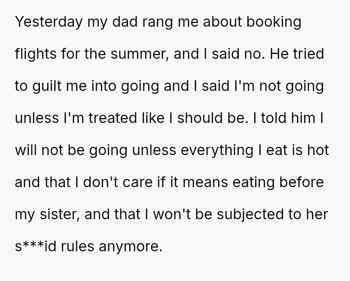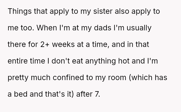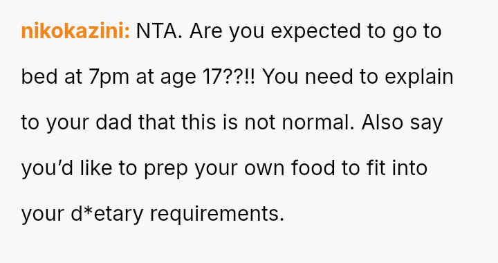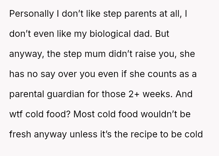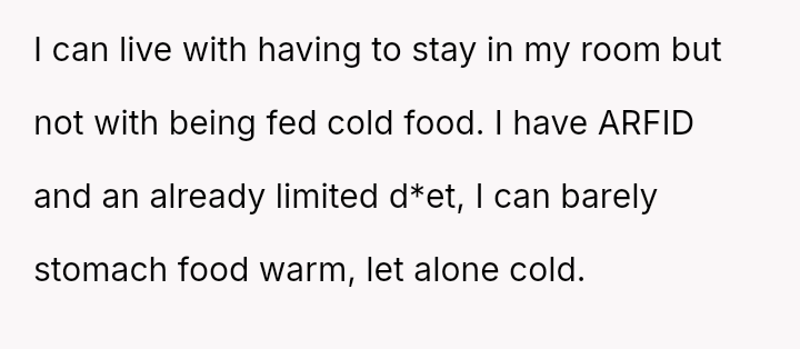 The original poster (OP) expressed strong resistance to visiting their father and stepmother due to restrictive and uncomfortable living conditions, particularly regarding food temperature and curfew, which conflict directly with the OP's es**blished d*etary needs (ARFID).