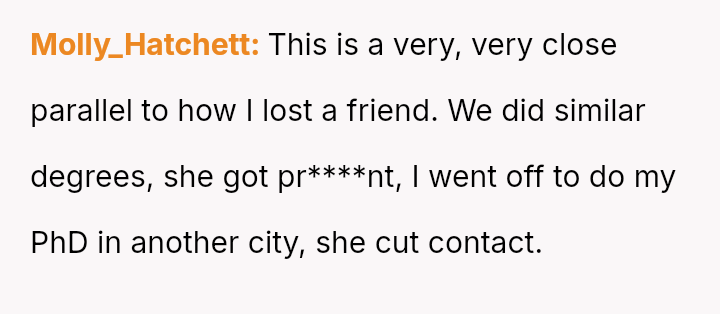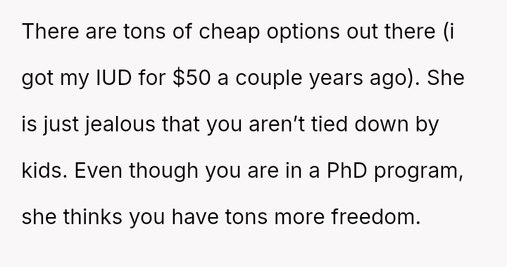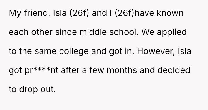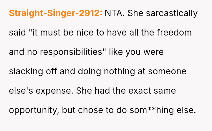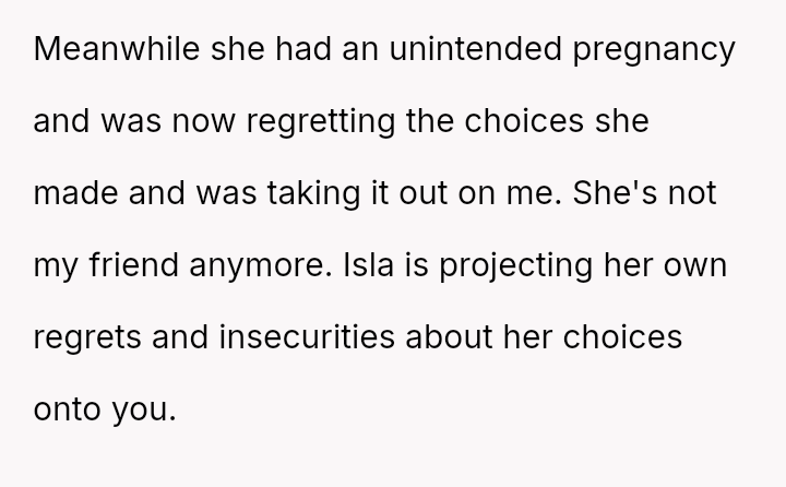 The original poster (OP) responded defensively and harshly to her friend Isla’s jealous comments about her freedom, leading to a significant conflict based on Isla’s resentment over her life choices versus the OP’s academic path.