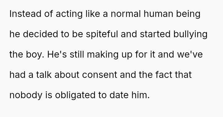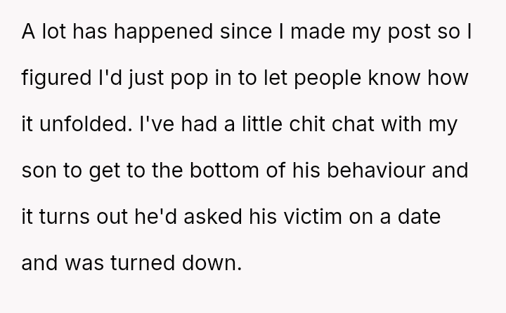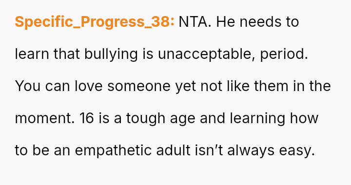 The original poster (OP) struggled to manage their 16-year-old son's bullying behavior, which stemmed from rejection after asking a cla*smate out.
