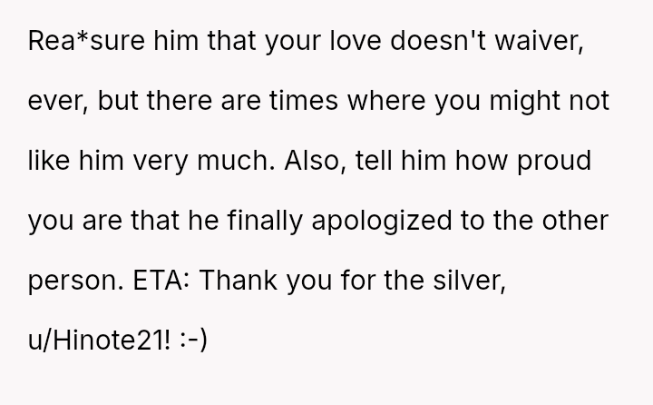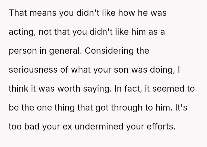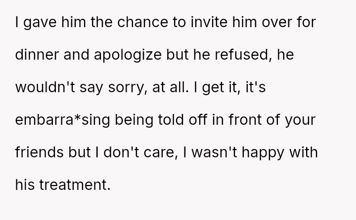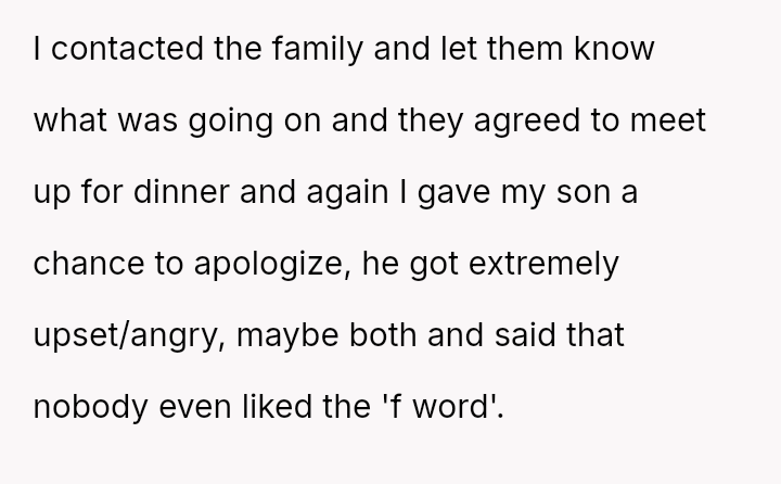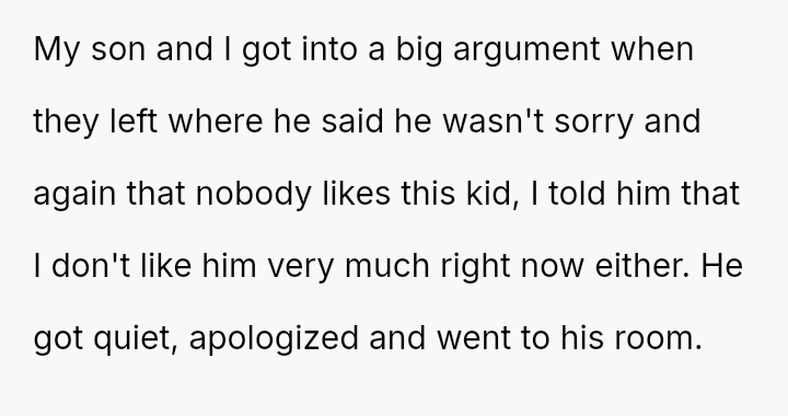 The OP's strong desire to enforce accountability clashed directly with the son's initial refusal to apologize and his feelings of embarra*sment, leading to escalating conflict, including the OP stating they did not like their son very much.