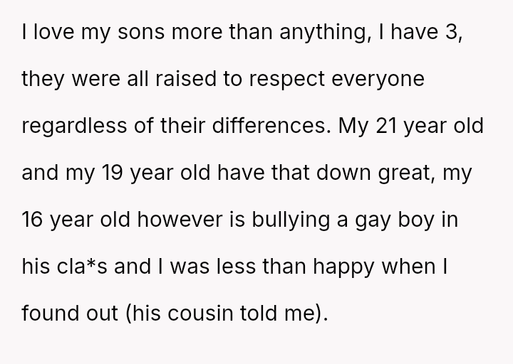 Despite raising them to embrace respect and kindness, her 16-year-old’s bullying of a gay cla*smate shatters the harmony she believed they shared, forcing her to face a raw and uncomfortable reality.