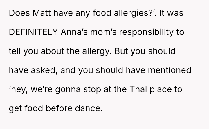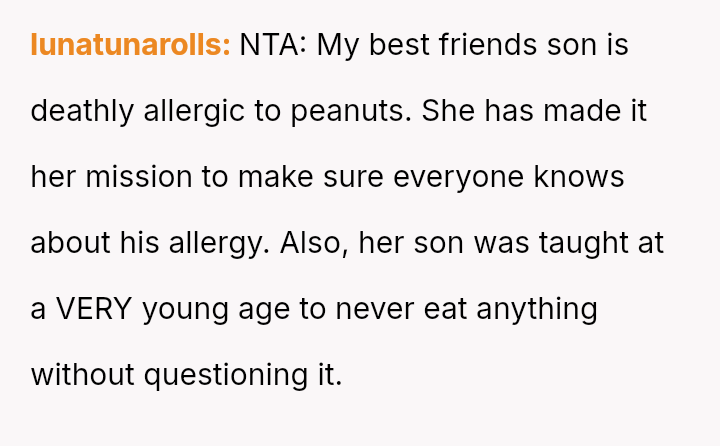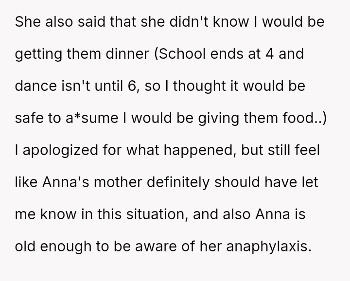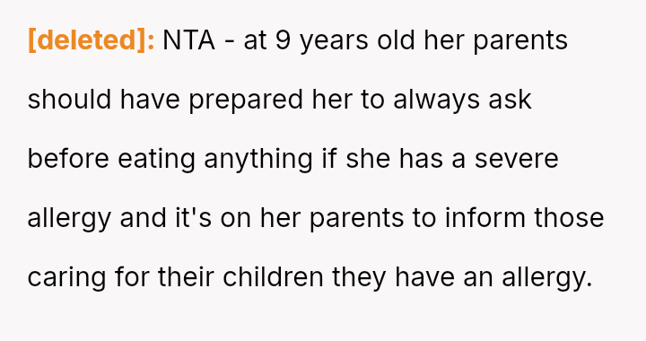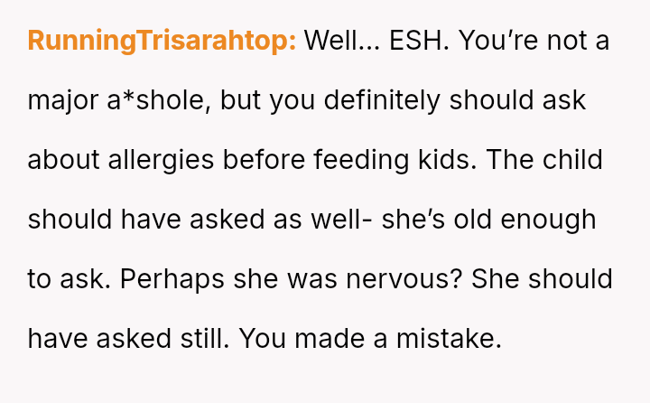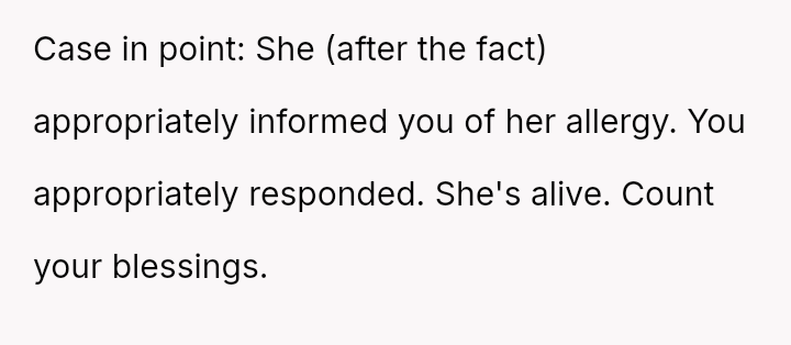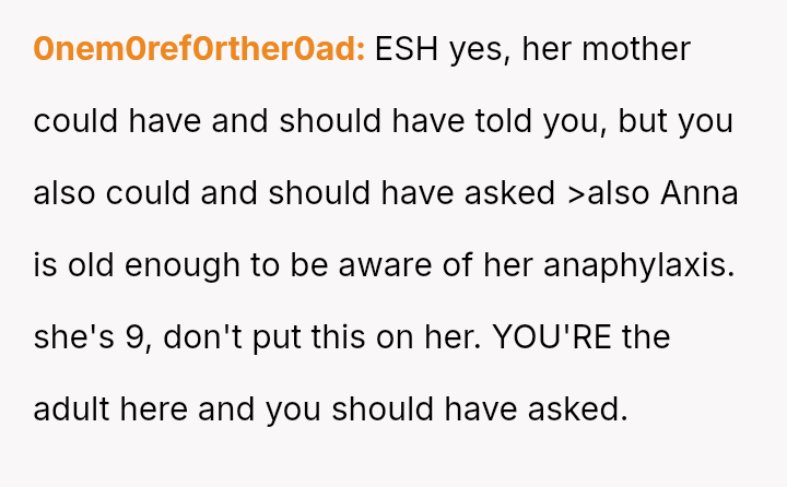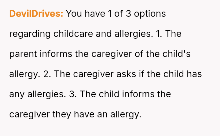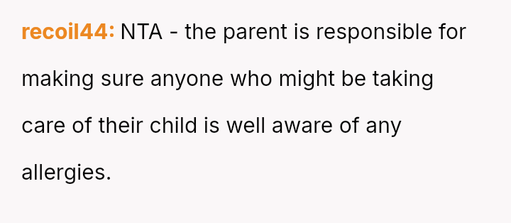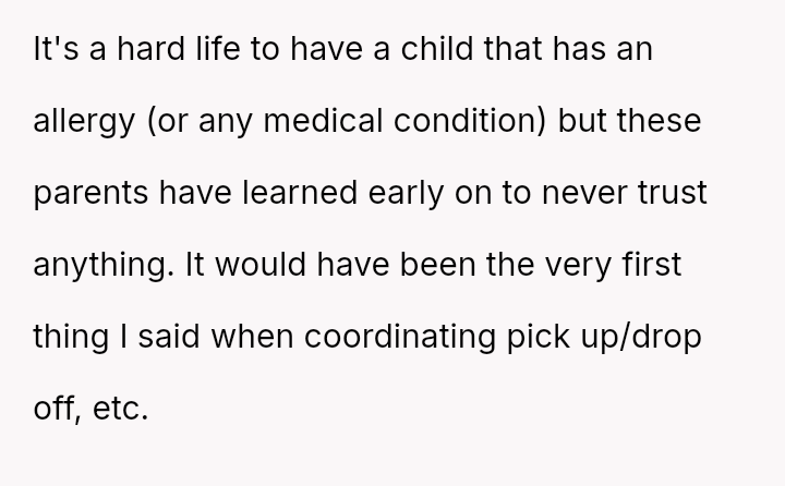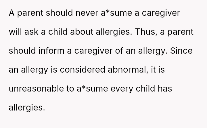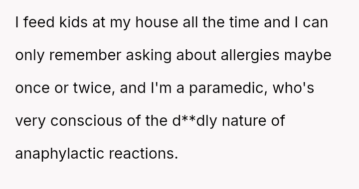 Considering that the OP took immediate action to seek emergency care, should the primary responsibility for this near-tragedy rest on the parent who failed to communicate a life-threatening medical condition, or on the caregiver who failed to proactively confirm allergy status before serving a meal? Where should the line be drawn between parental duty to inform and caregiver duty to inquire?