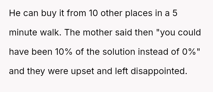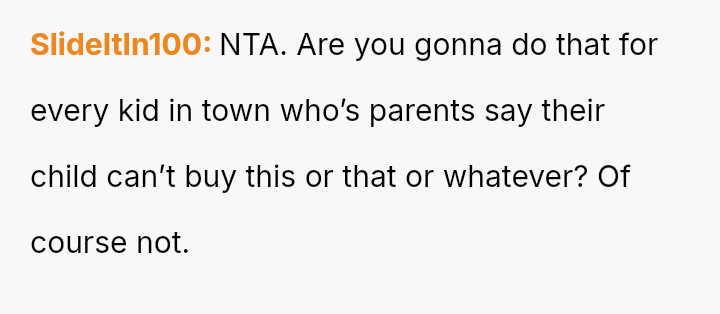 Given the OP's stance on commercial freedom versus the parents' request for a*sistance in guiding their child's adherence to family rules, the debate centers on where a small business's responsibility ends: Should the owner prioritize strict transactional neutrality, or is there a moral obligation to a*sist community members, especially when dealing with minors, even if it means setting a precedent for refusing sales?