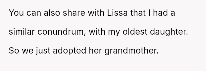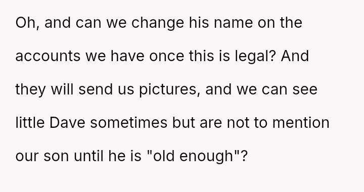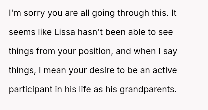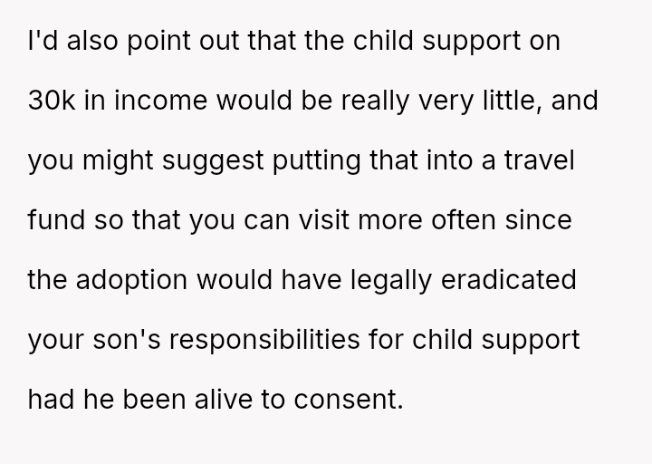 The OP's initial generous support toward the child's mother, Lissa, has soured because Lissa and her new husband, Allen, wish to formalize adoption, relocate, and effectively erase the memory of the OP's deceased son from the child's life.