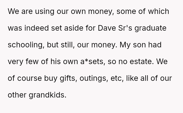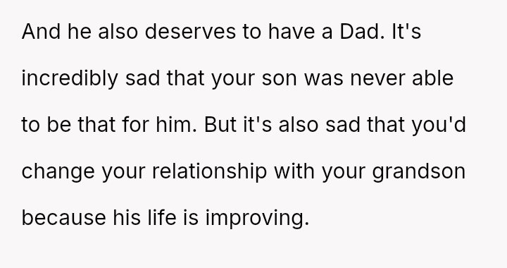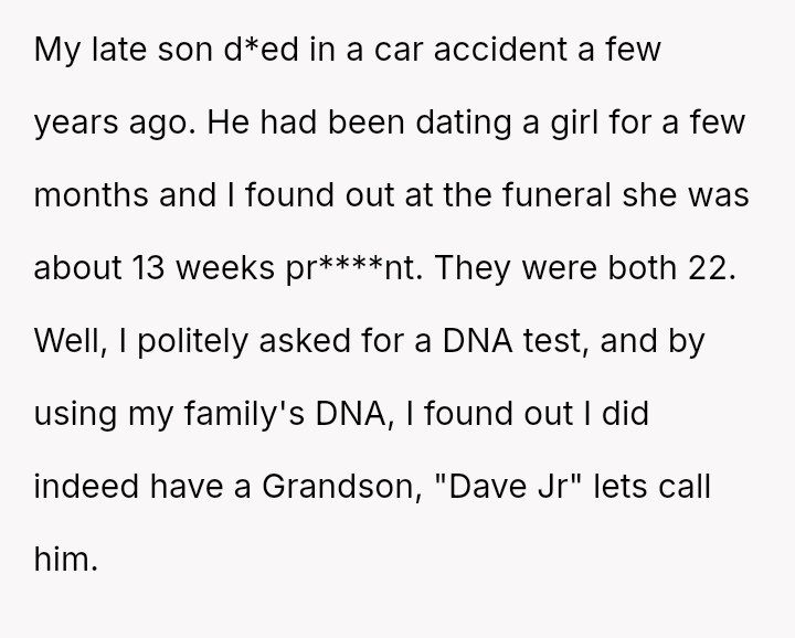 The original poster (OP) is experiencing profound grief following the loss of their son and is now facing a deep conflict regarding their relationship with their grandson, Dave Jr.