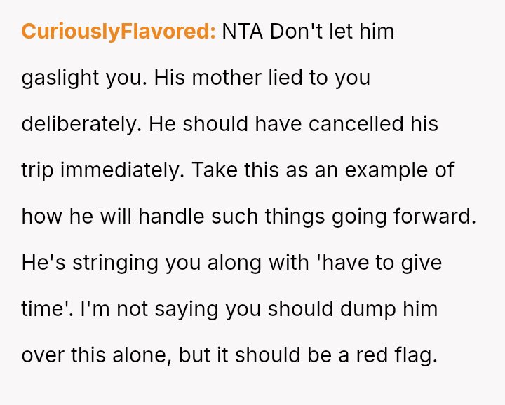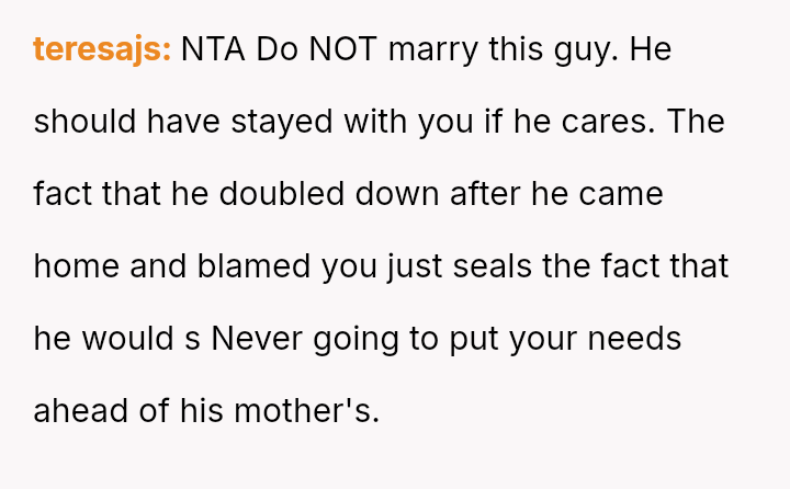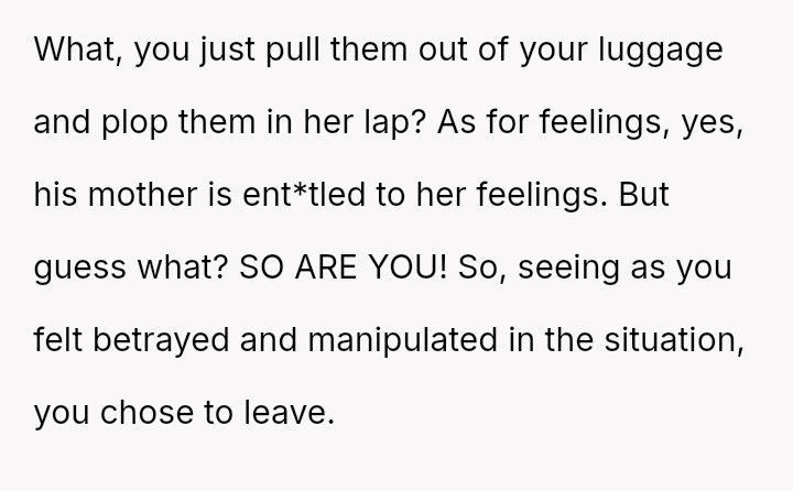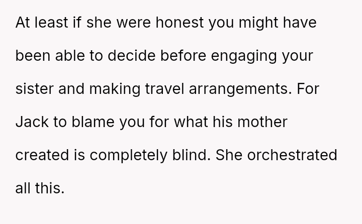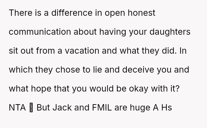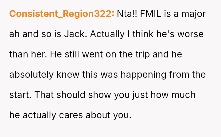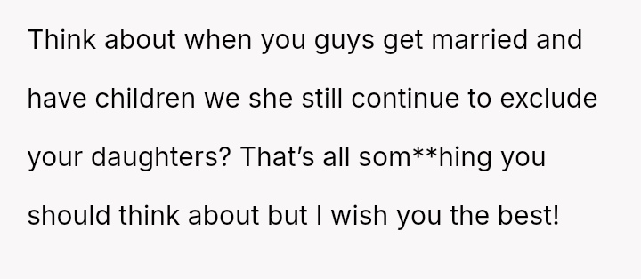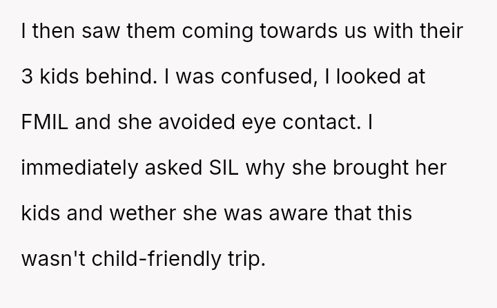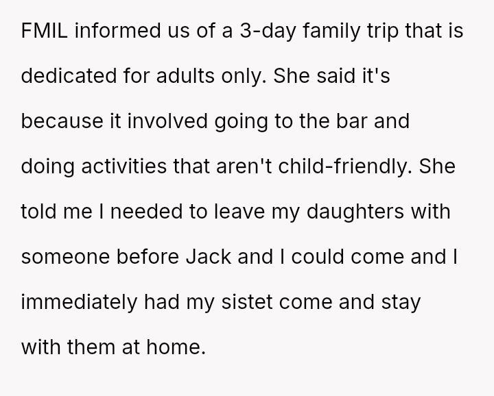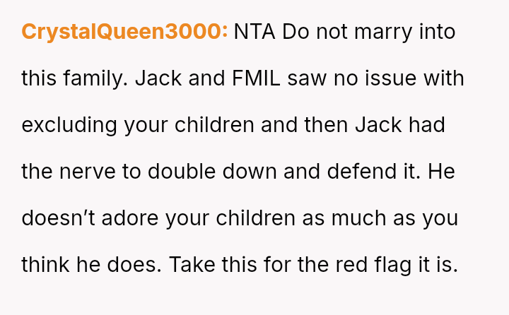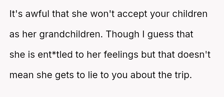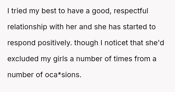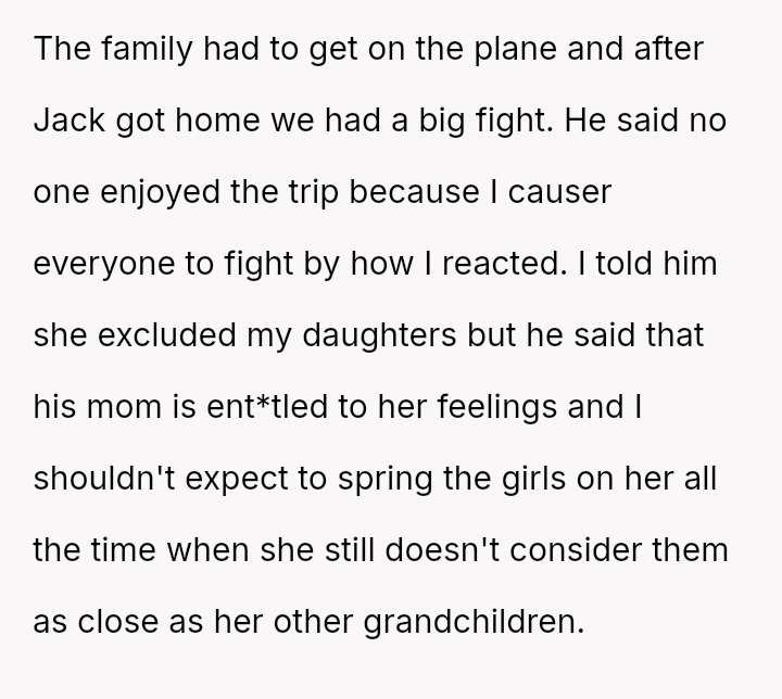 The original poster (OP) experienced significant emotional pain when her fiancé's mother actively excluded her daughters, leading to a breakdown in trust and an abrupt departure from a planned family trip.