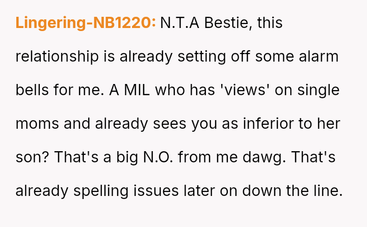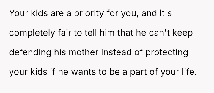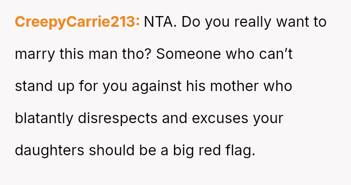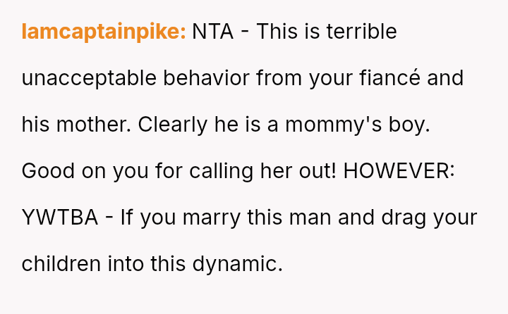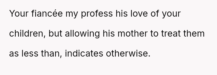 Is it more important for the OP to prioritize protecting her children from perceived disrespect and emotional exclusion immediately, or should she prioritize maintaining the s**bility of her relationship with her fiancé by exercising patience and allowing time for his mother's views to change?