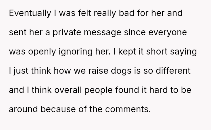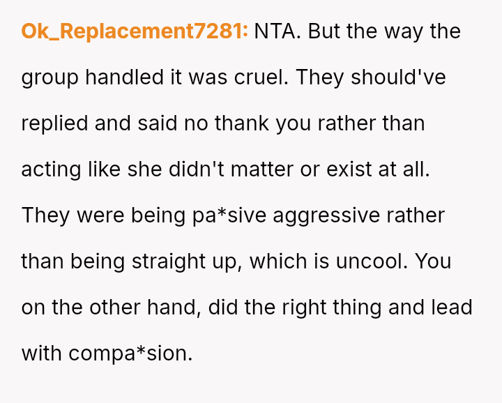 The OP acted out of pity to address the ignored messages, resulting in the new member leaving the group feeling heartbroken and confused about the rejection.