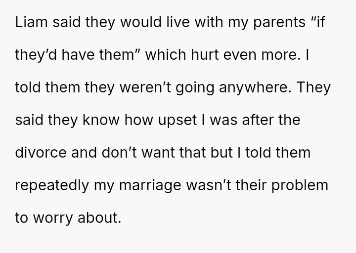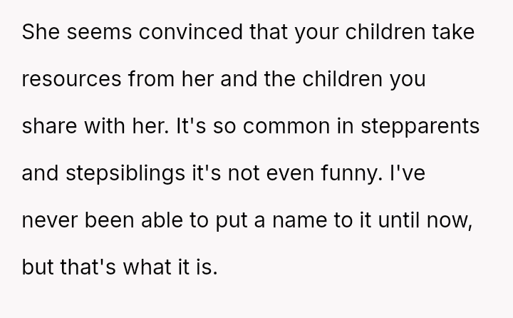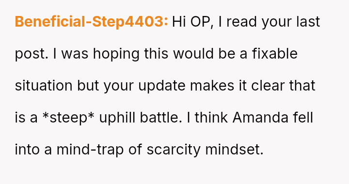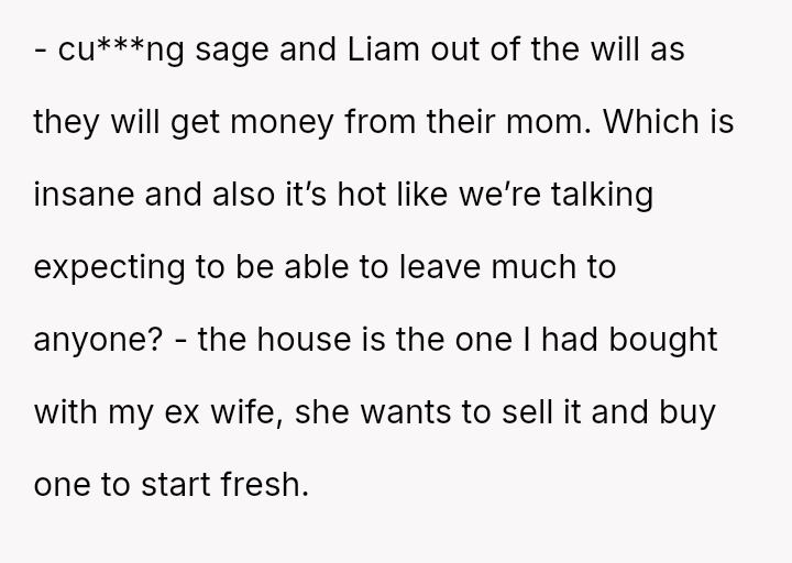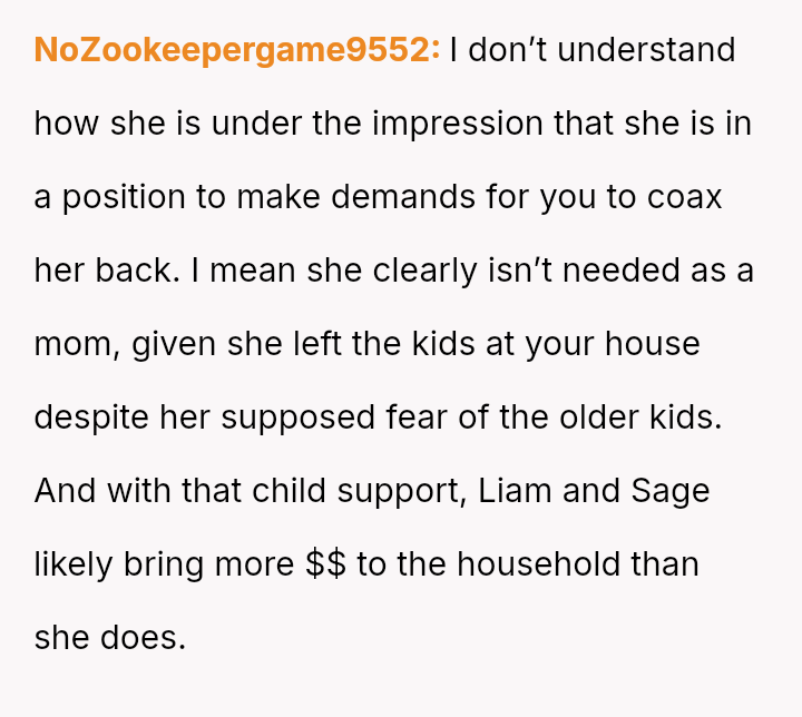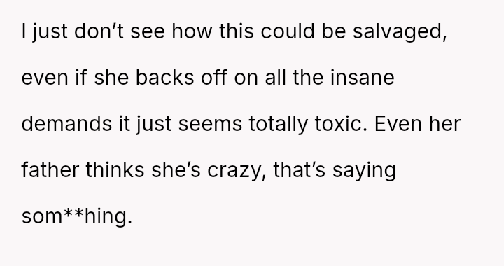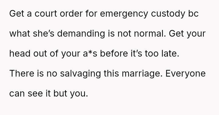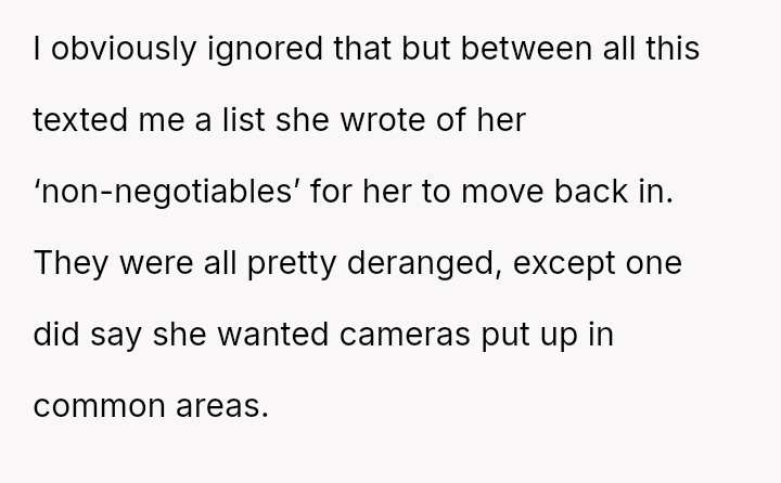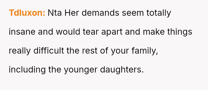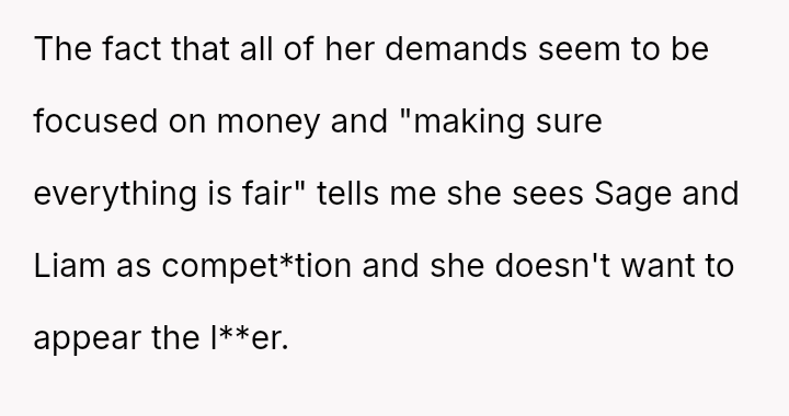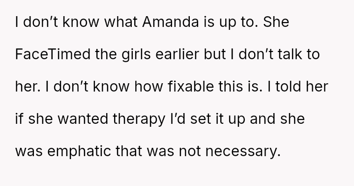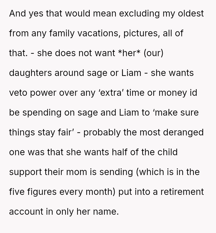 This contrasts sharply with Amanda's extreme demands for reconciliation, which focus almost entirely on controlling a*sets and separating the existing family units.