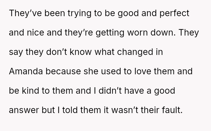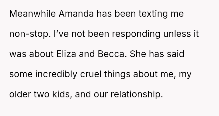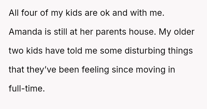 The parent (OP) is currently living with their four children after their partner, Amanda, moved out to stay with her parents. The situation has become complicated by the older two children expressing deep distress about living with Amanda full-time.