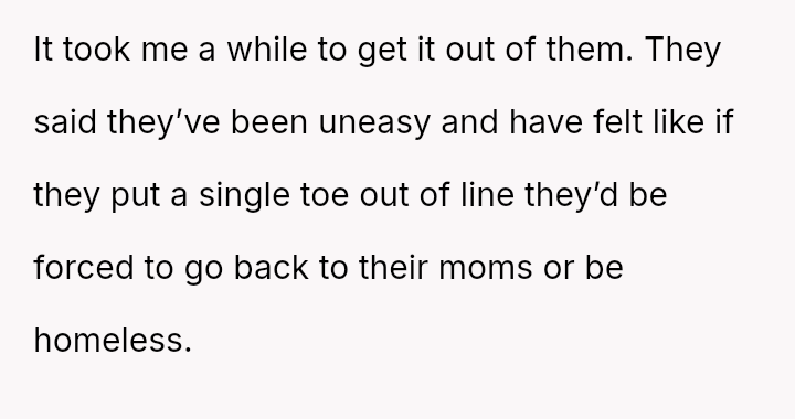 The older children reported feeling intensely anxious, fearing they would be sent back to their mother or become homeless if they made any mistake.