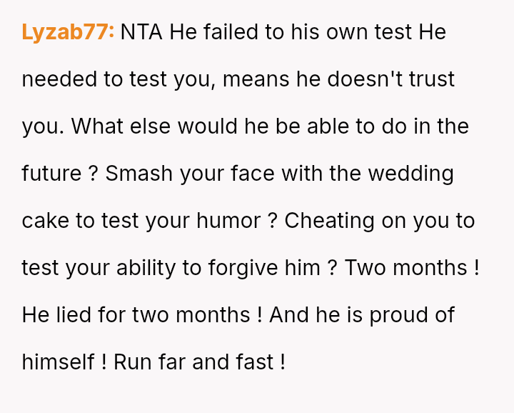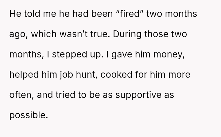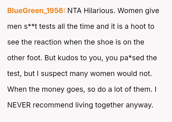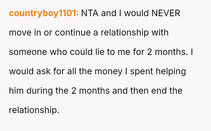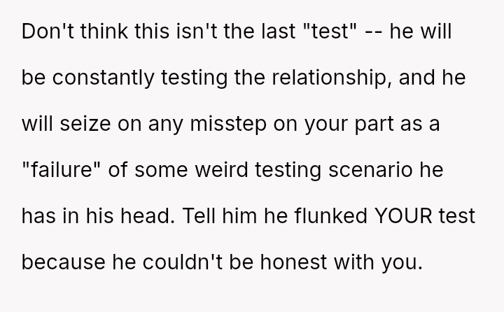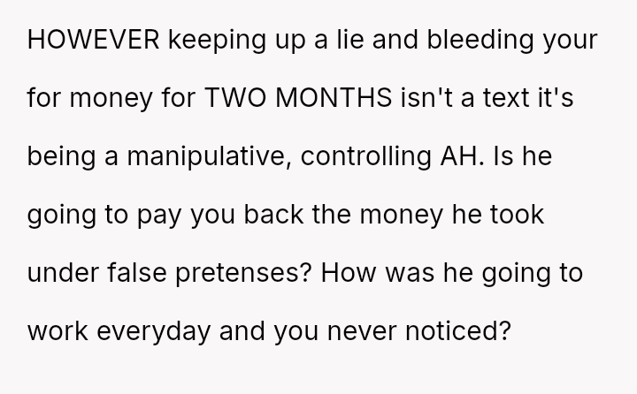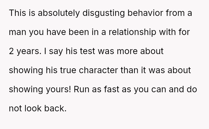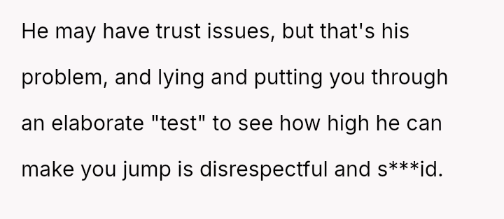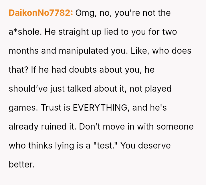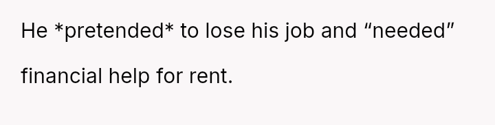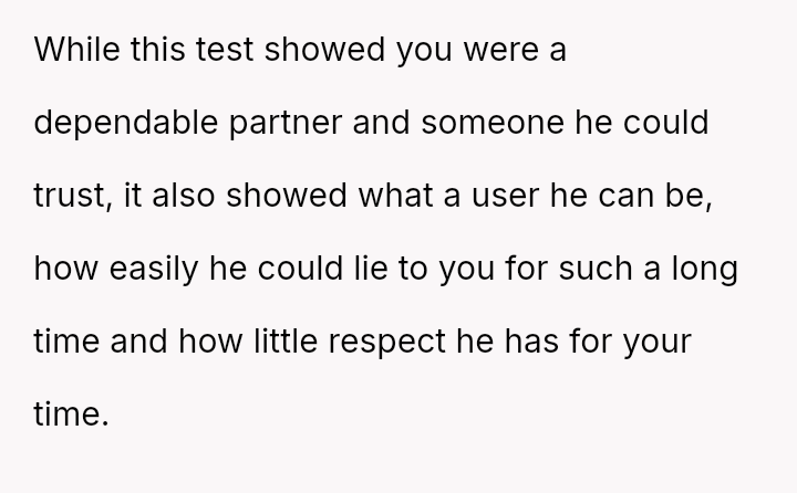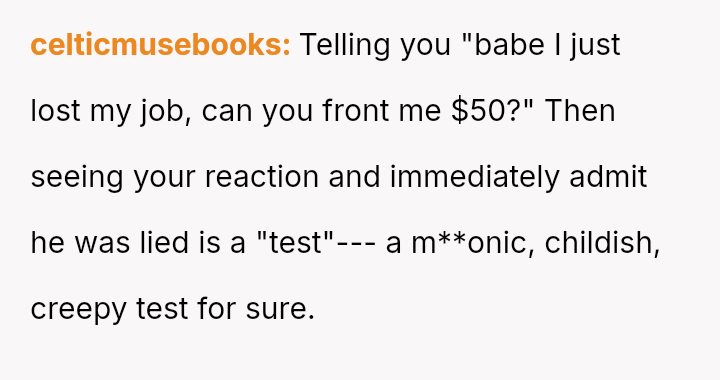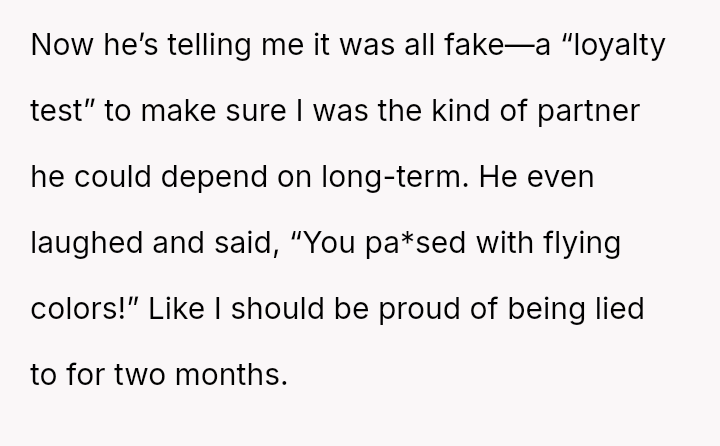 The original poster experienced a significant breach of trust when her boyfriend orchestrated a months-long deception under the guise of job loss to gauge her commitment.