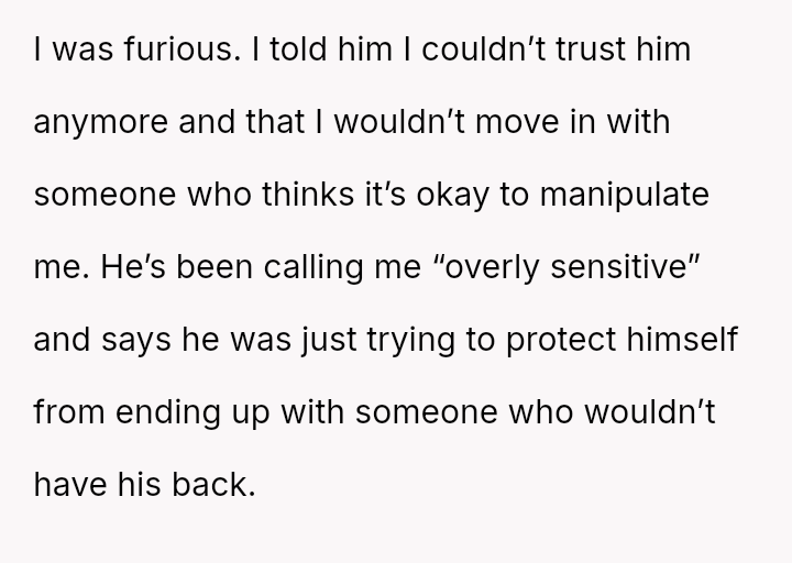 Is the poster wrong for ending the trust required for cohabitation because her partner intentionally used deception and emotional manipulation as a prerequisite for commitment, or is the boyfriend justified in viewing this as a necessary, albeit unorthodox, measure to ensure long-term partnership security?