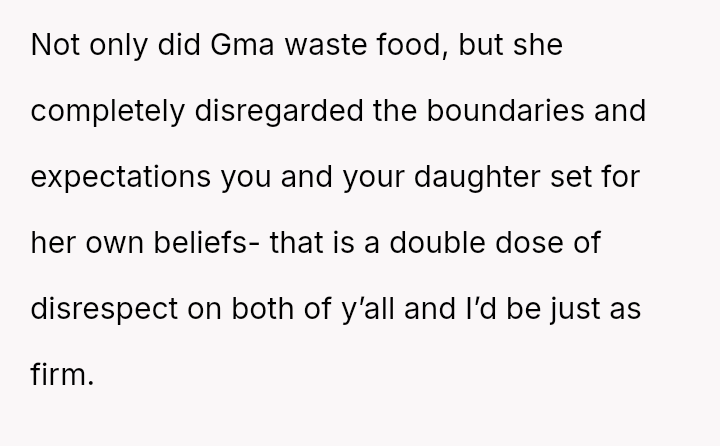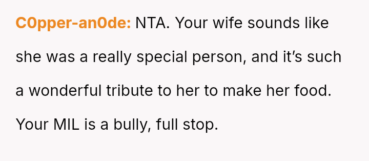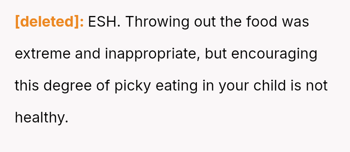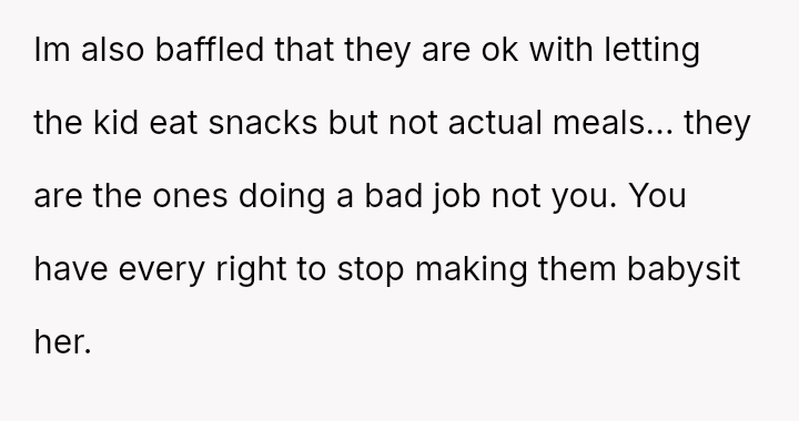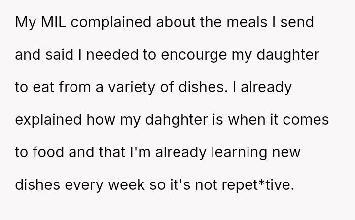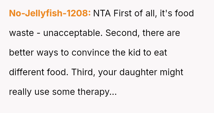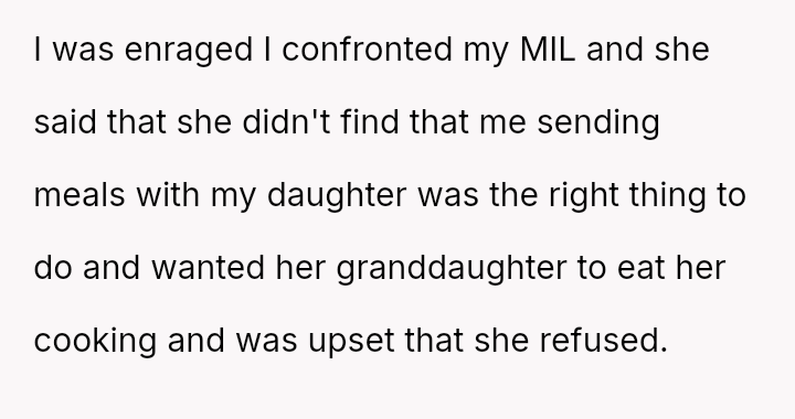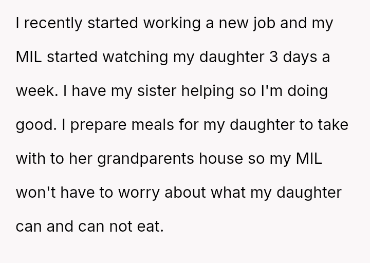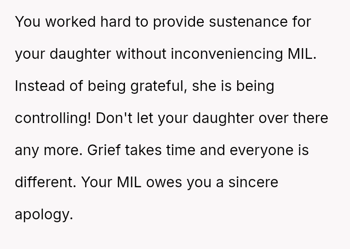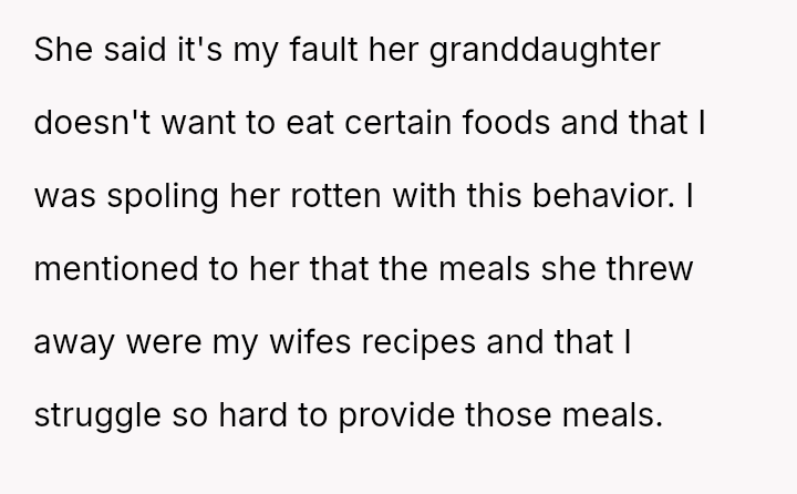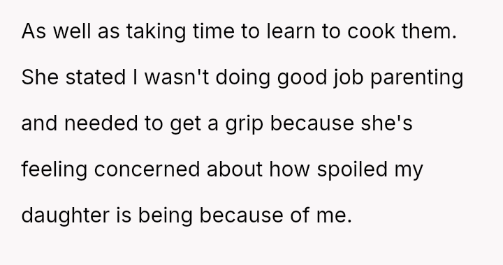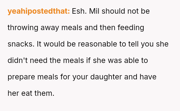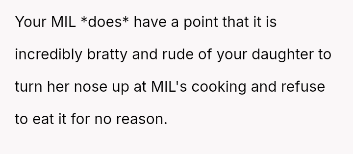 His mother-in-law (MIL), conversely, has prioritized her own desire to cook and a*sert her preferred parenting standards over respecting the OP's efforts and the child's emotional needs.