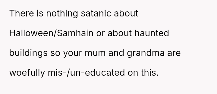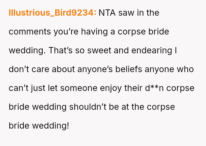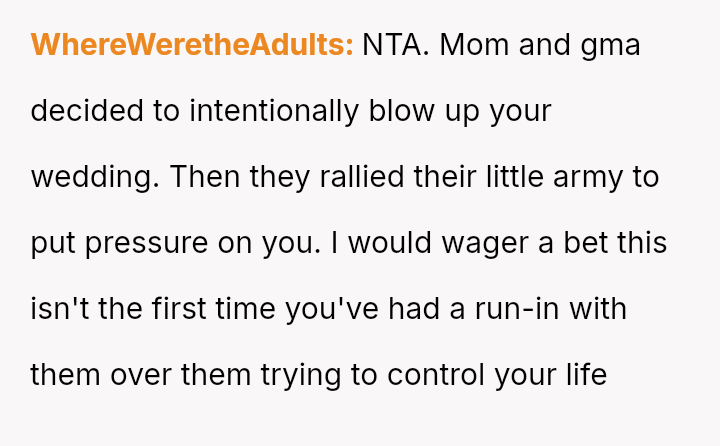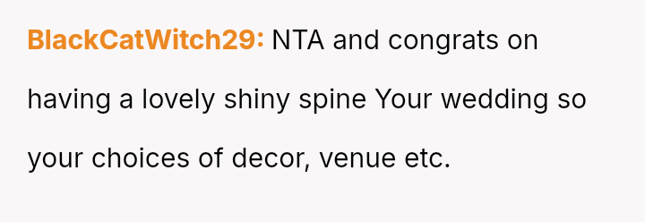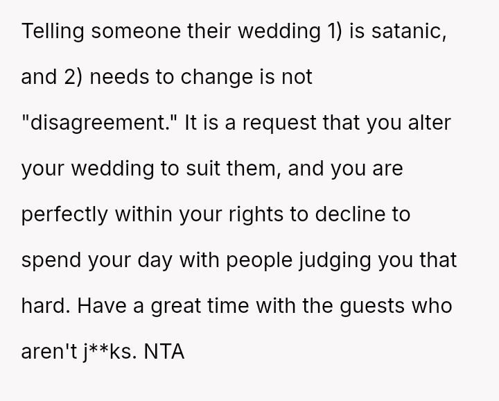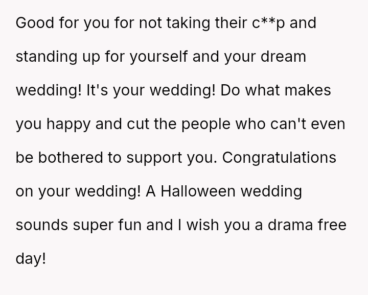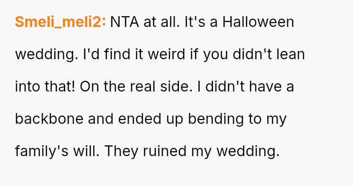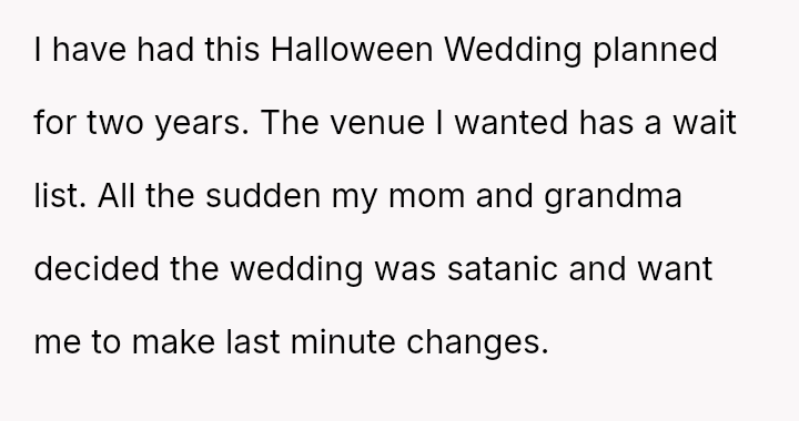 The original poster (OP) is facing significant emotional distress due to their mother and grandmother suddenly objecting to their long-planned Halloween wedding theme, labeling it as 'satanic.' The central conflict arises from the OP's firm decision to proceed with their original plans, which resulted in them uninviting family members who supported the objection or engaged in perceived power struggles, leading to a major rift.
