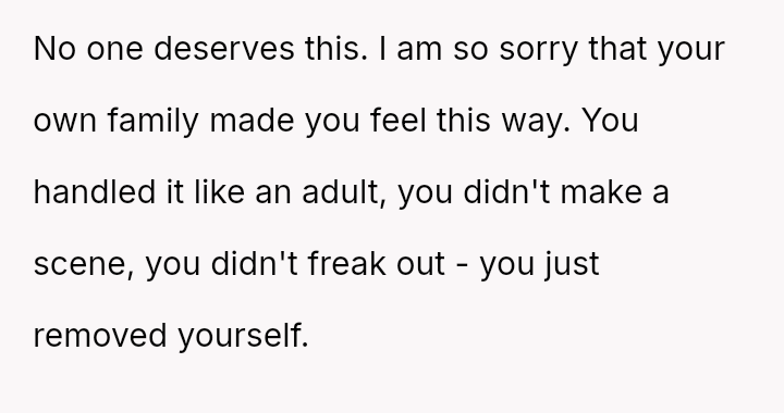 The core question for debate is whether the OP was justified in prioritizing their immediate emotional survival by leaving the event, or if the expectation was reasonable for the OP to suppress their pain for one night to allow the family to celebrate without disruption. Was this a necessary act of self-preservation or an overreaction that unfairly impacted others?