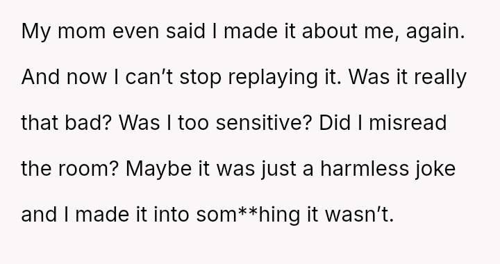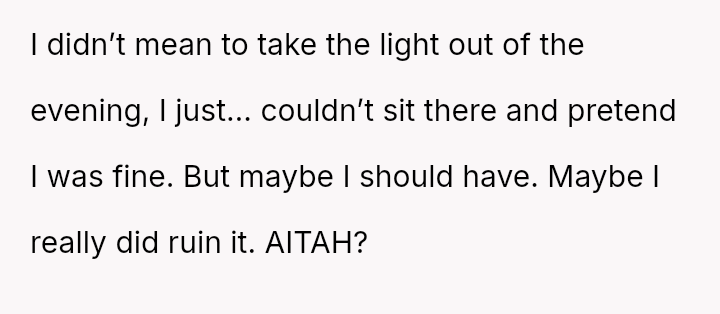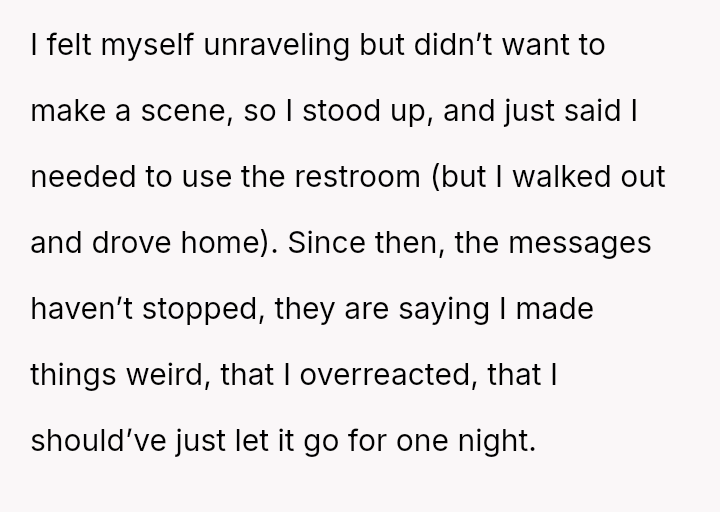 Following this, the OP felt overwhelmed, left the dinner abruptly, and drove home. Now, the OP is receiving numerous messages suggesting they overreacted and ruined the event, leading the OP to question if their reaction was too sensitive.
