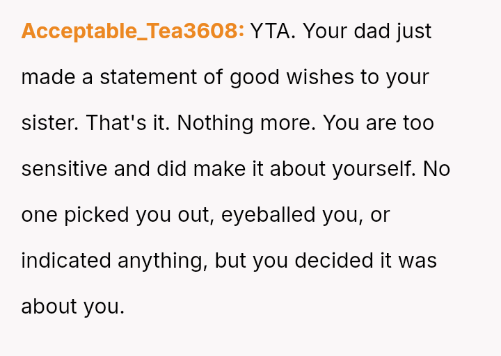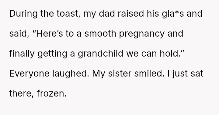 During a recent large family dinner celebrating the OP's sister's pregnancy, the OP's father gave a toast wishing for a smooth pregnancy and finally getting a grandchild they could hold.