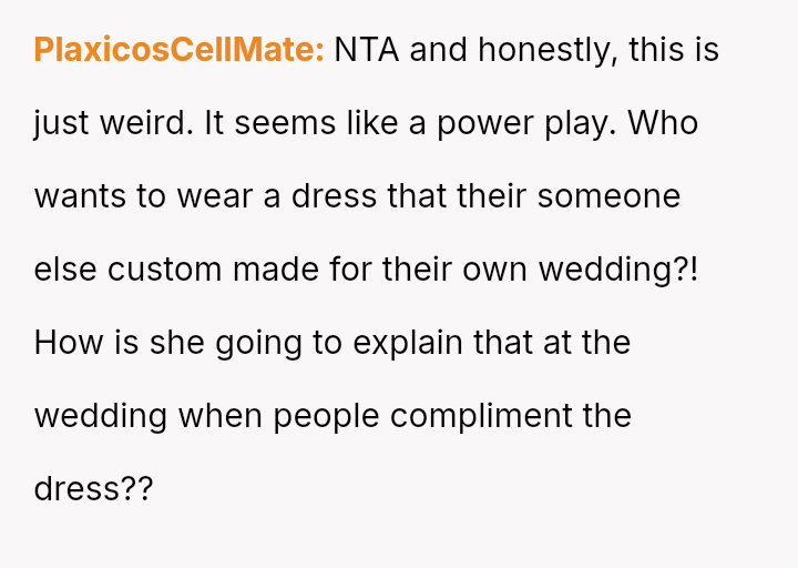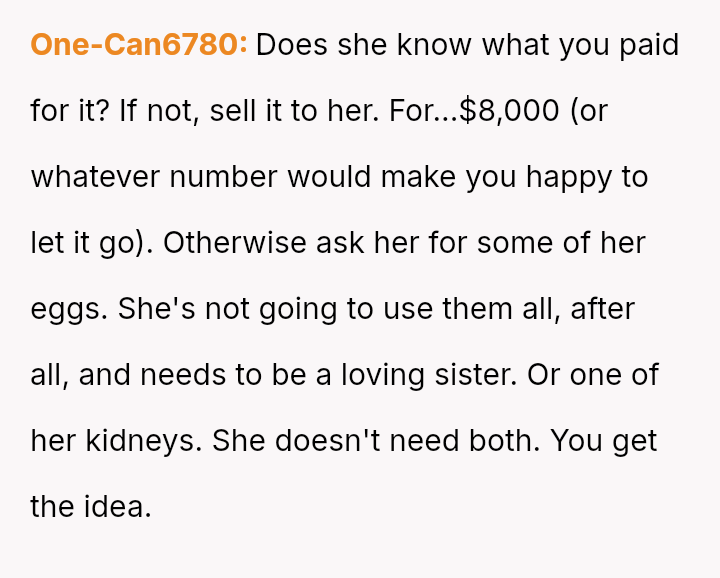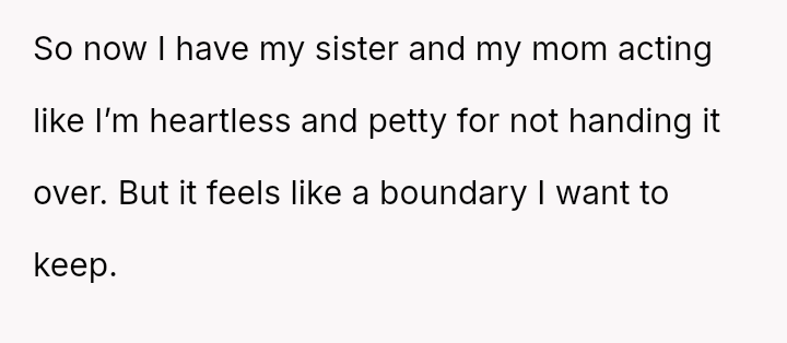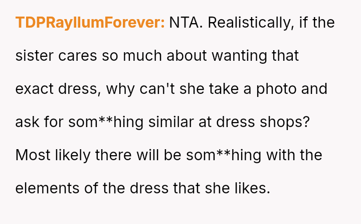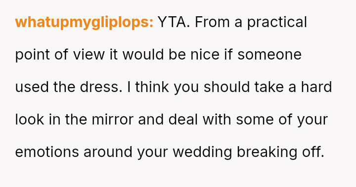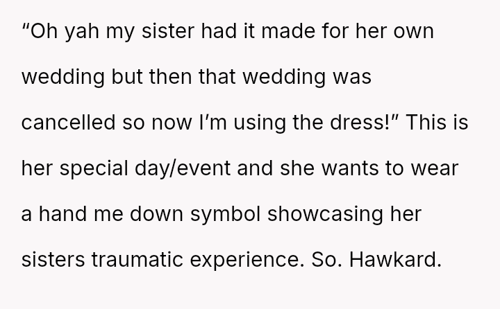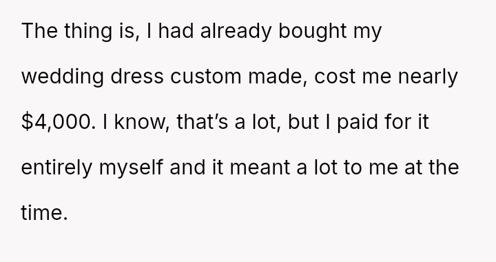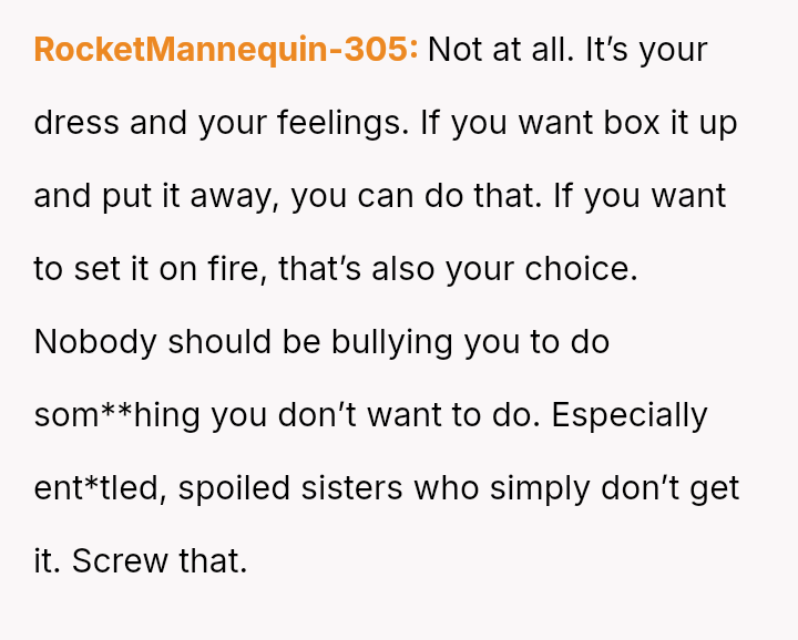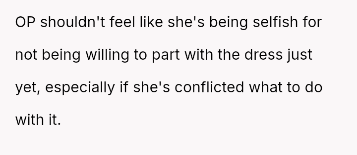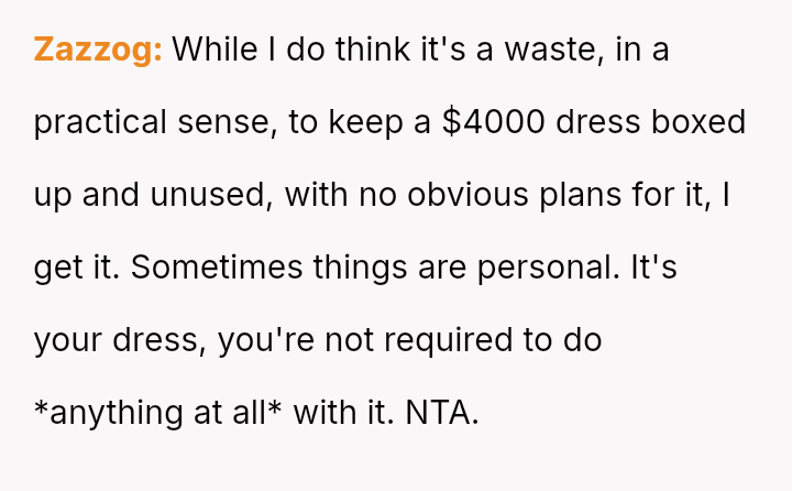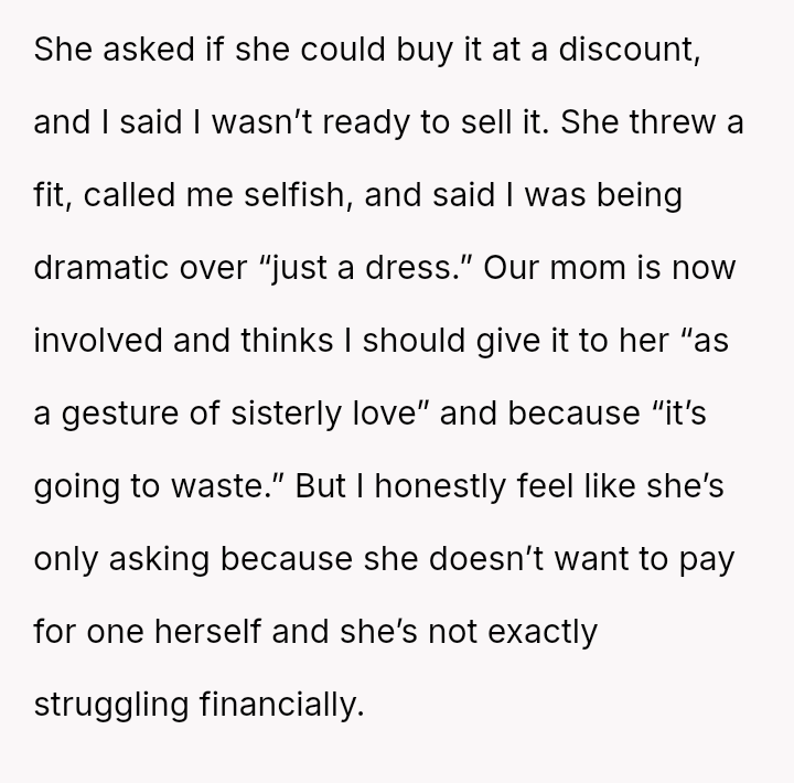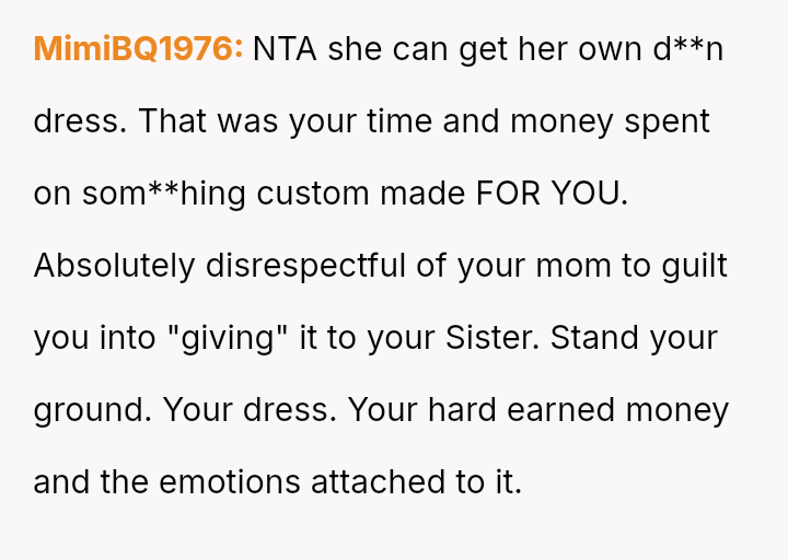 The original poster is facing significant pressure from her sister and mother to surrender a costly, custom-made wedding dress that she purchased for a canceled wedding.