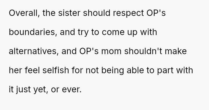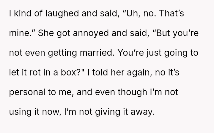 Is the OP obligated to give up her personal property, which holds significant emotional weight from a past commitment, simply because she is not currently using it, or is her right to maintain emotional boundaries and ownership absolute, even when pressured by family expectations of sharing?