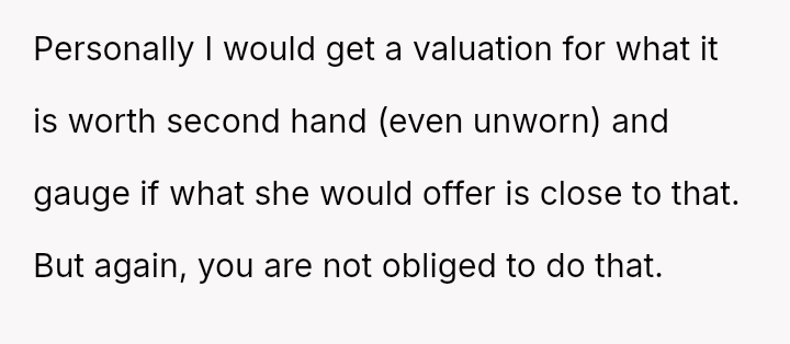 Her internal conflict stems from wanting to respect her personal emotional boundaries regarding a significant, unfulfilled life event, contrasted sharply with the external expectation that she must sacrifice this item for perceived familial duty and practicality.