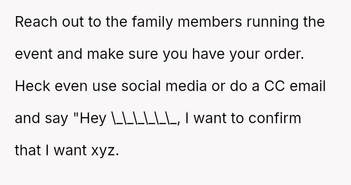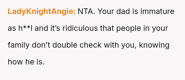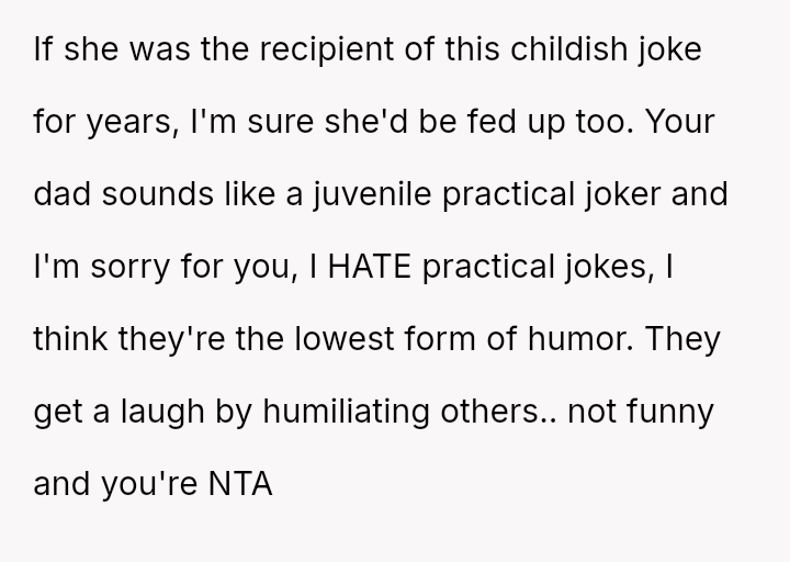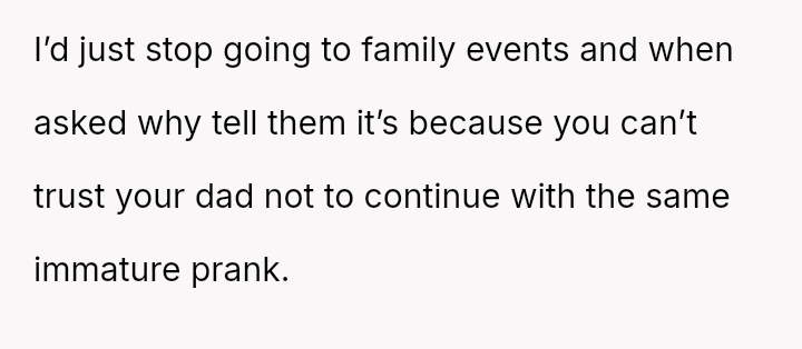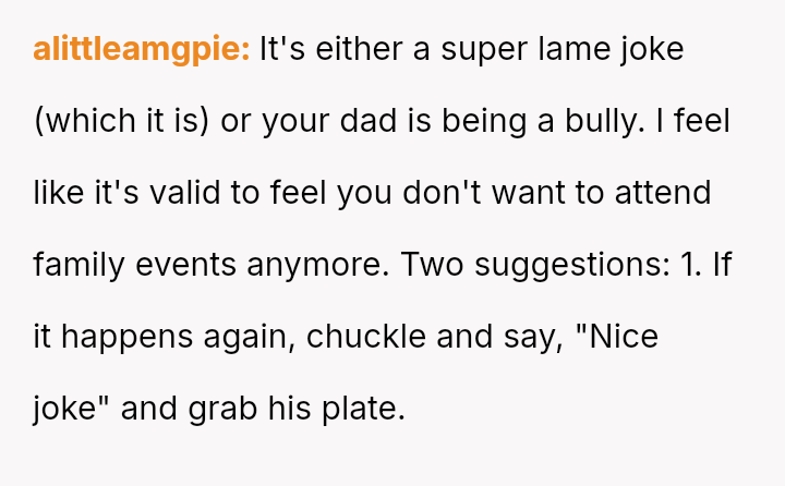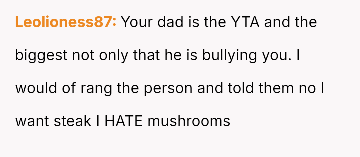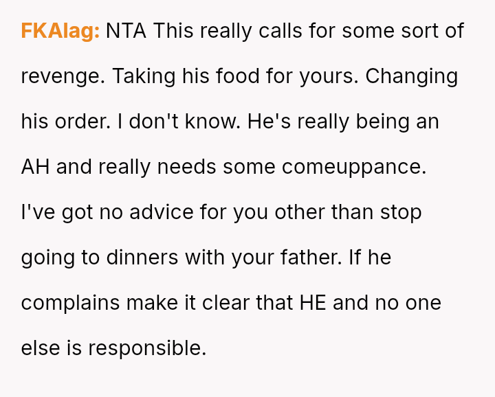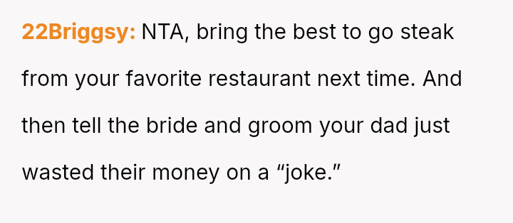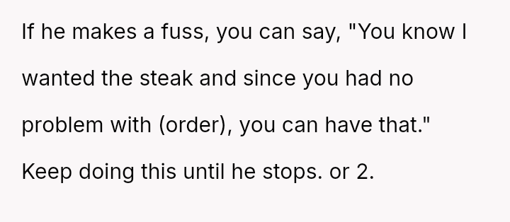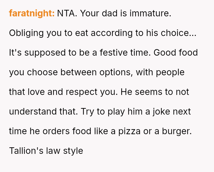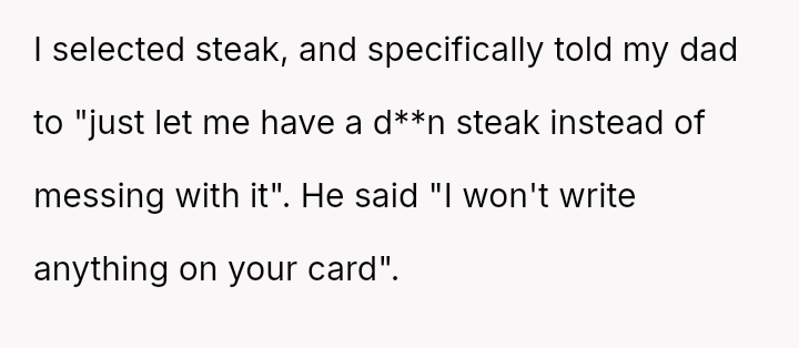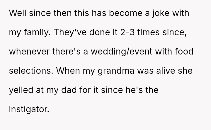The original poster (OP) experienced repeated frustration due to a long-running family joke orchestrated primarily by their father, involving intentionally sabotaging their pre-selected meal choices at formal events.