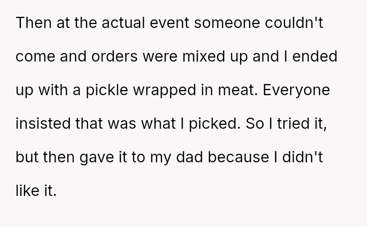 What began as a confused plate swap — a teenage boy expecting steak but receiving a bizarre pickle-wrapped meat dish — turned into a cherished family story, filled with laughter, teasing, and a hint of playful mischief.
