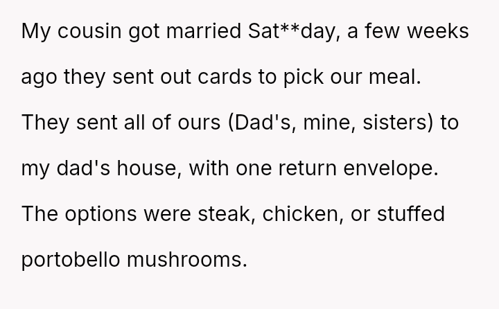 This culminated in the OP being served an unwanted vegetarian dish at a wedding after their father falsely claimed they had changed their d*et, leading the OP to refuse the meal and leave the table.