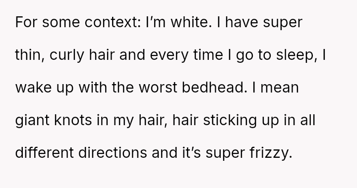 The original poster (OP), who has thin, curly white hair, struggled significantly with severe bedhead, including knots and frizz, every morning.