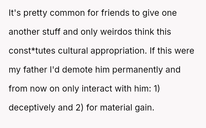 The girlfriend reacted strongly, accusing the OP of racism and cultural appropriation, leading to a heated argument that ended with the OP asking both the girlfriend and their father to leave their apartment, causing them to cut their visit short. Now, the OP is facing nonstop pressure from their father to apologize to the girlfriend.