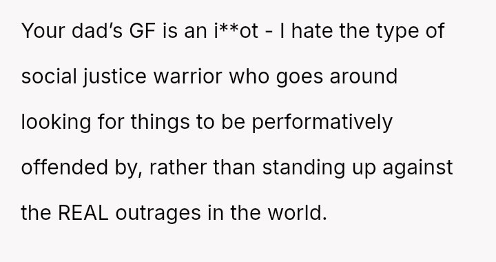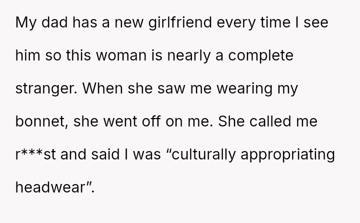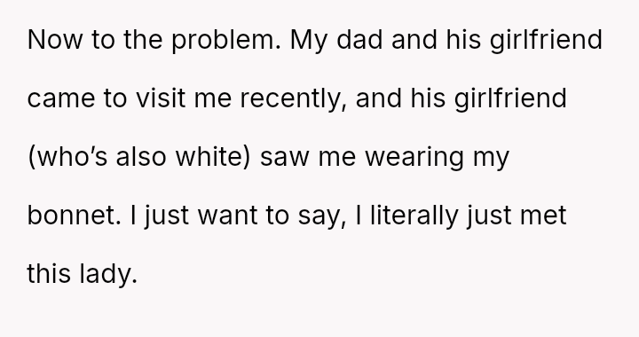 However, the situation escalated when the OP's father's new girlfriend, whom the OP barely knew, saw them wearing the bonnet.
