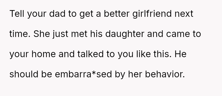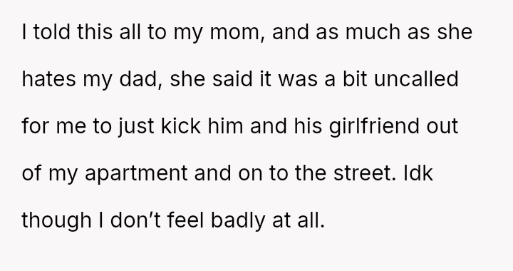 The central question is whether the OP was wrong to immediately eject their father and his girlfriend from their apartment following the argument, or if the girlfriend's strong reaction justified the swift removal.