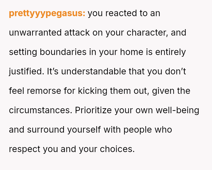 The OP feels justified in defending their choice and asking the guests to leave their home, despite their father's disappointment and insistence on an apology.