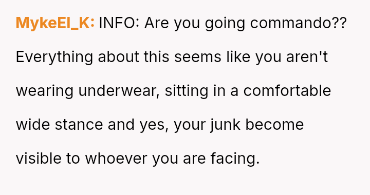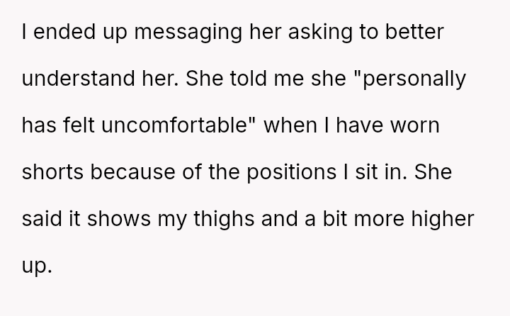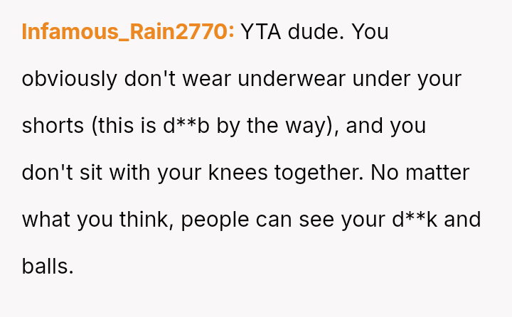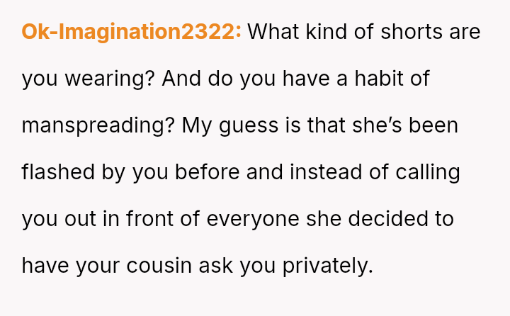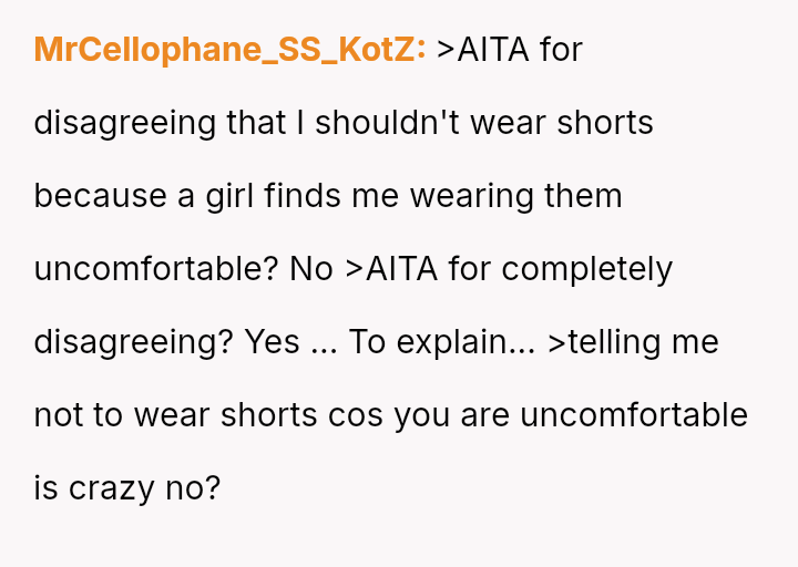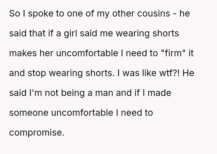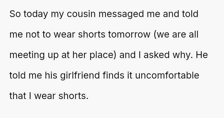 The original poster (OP) faces a conflict between maintaining a lifelong habit of wearing shorts and accommodating a cousin's girlfriend's stated discomfort with how the OP sits while wearing them.