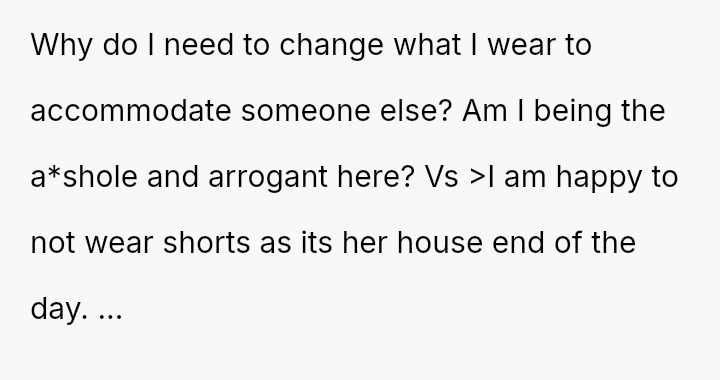 While the OP is willing to abide by the house rules by not wearing shorts at the cousin's home, the external pressure from another cousin suggests the OP's refusal to universally change the habit or apologize is seen as stubborn or unmanly.