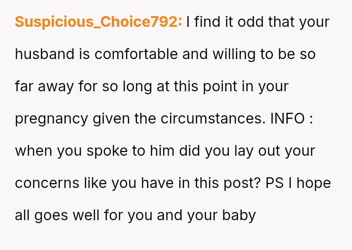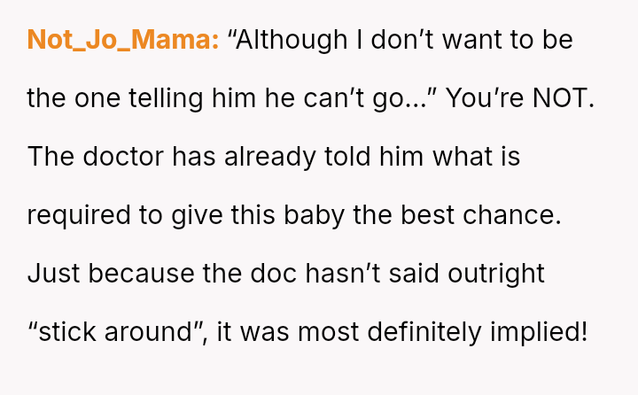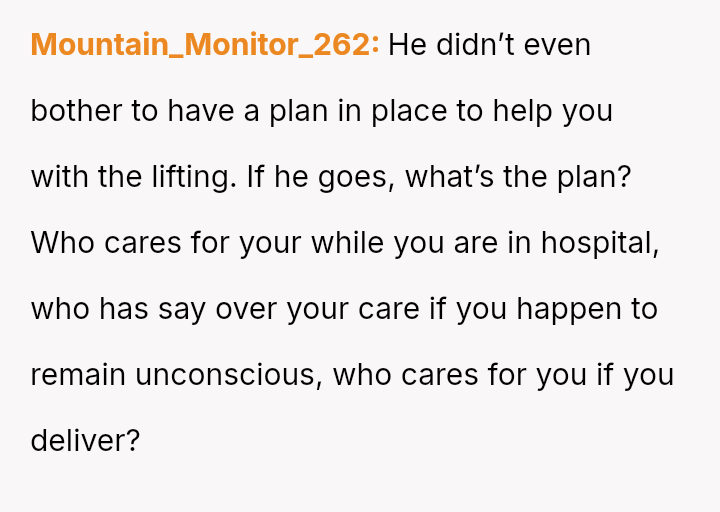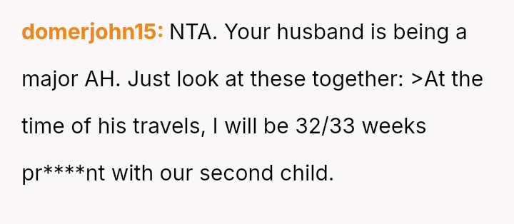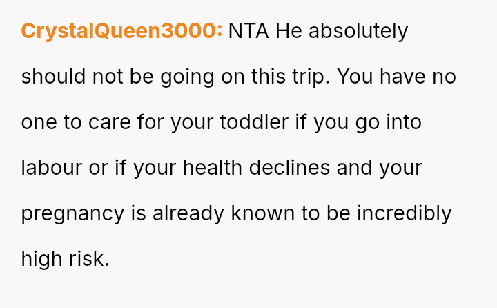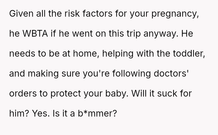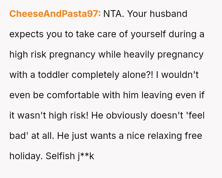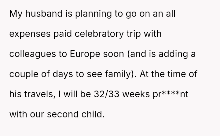 The original poster (OP) is facing significant emotional and practical distress regarding her husband's planned celebratory work trip to Europe while she is heavily pr****nt with a high-risk pregnancy.